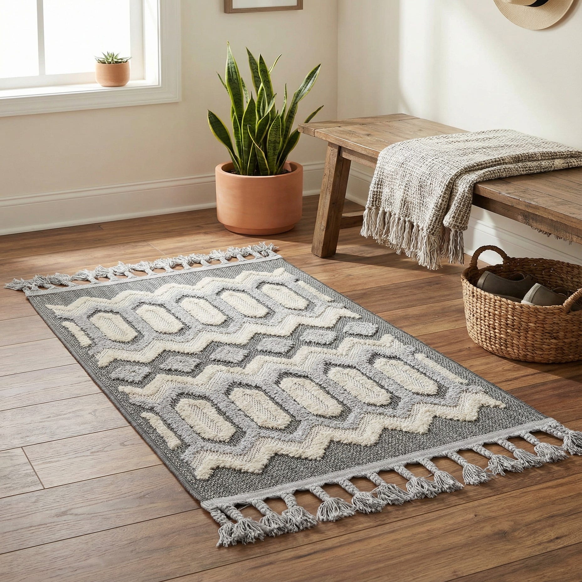 Machine made of 100% polypropylene, this rug offers a tactile high-low texture that works well in compact areas and layered arrangements. Place it in an entryway or hall, tuck it beside a bed, use it in front of a sink, or layer it in a living room to add pattern without overwhelming the space. It pairs naturally with light wood tones, matte black or brushed metal accents, and neutral linens—suiting modern farmhouse, casual contemporary, or relaxed boho interiors.