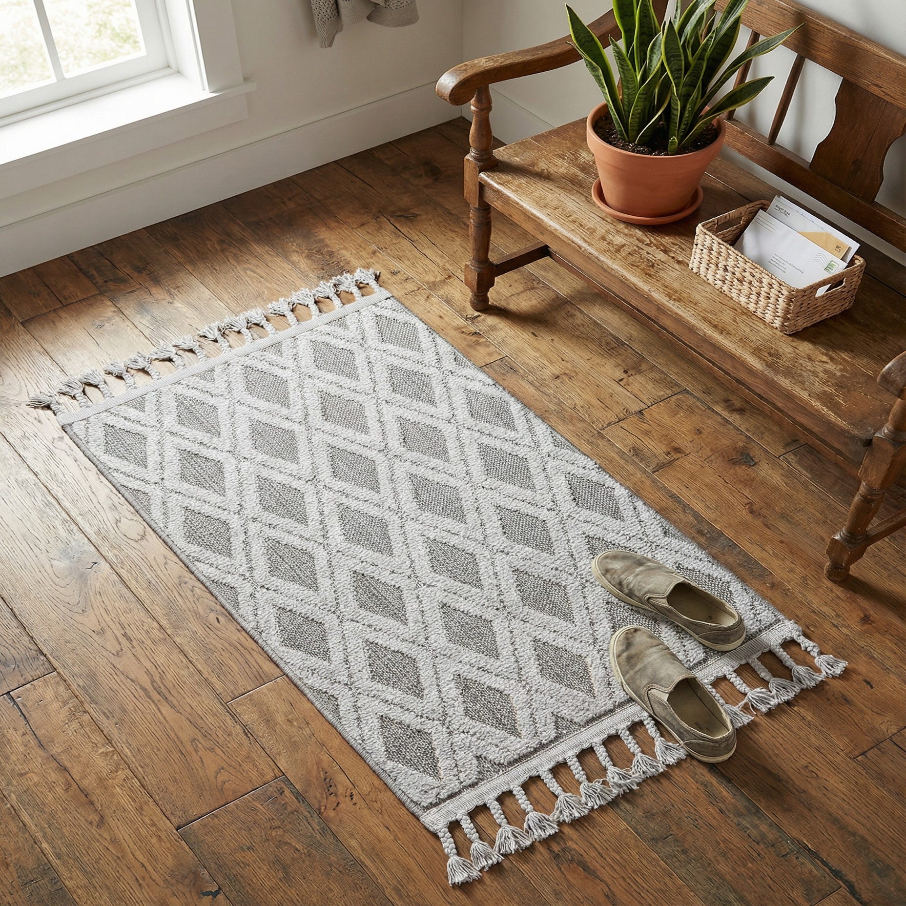 This rug suits a range of interiors—from modern farmhouse and transitional spaces to minimalist and relaxed boho rooms. Use it to anchor a small seating area, add pattern and warmth near a bedside, or place it in an entry to define the space and welcome guests. Pair with light-washed woods, matte metal accents, and neutral linens to let the charcoal base provide grounding contrast while the ivory and gray pattern lifts the overall palette.