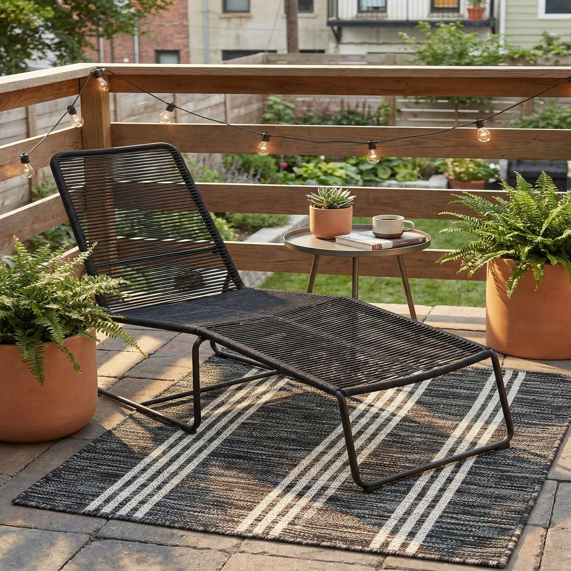 A 2x3 rectangular black and gray outdoor rug with horizontal white stripes, featuring a textured flatweave.