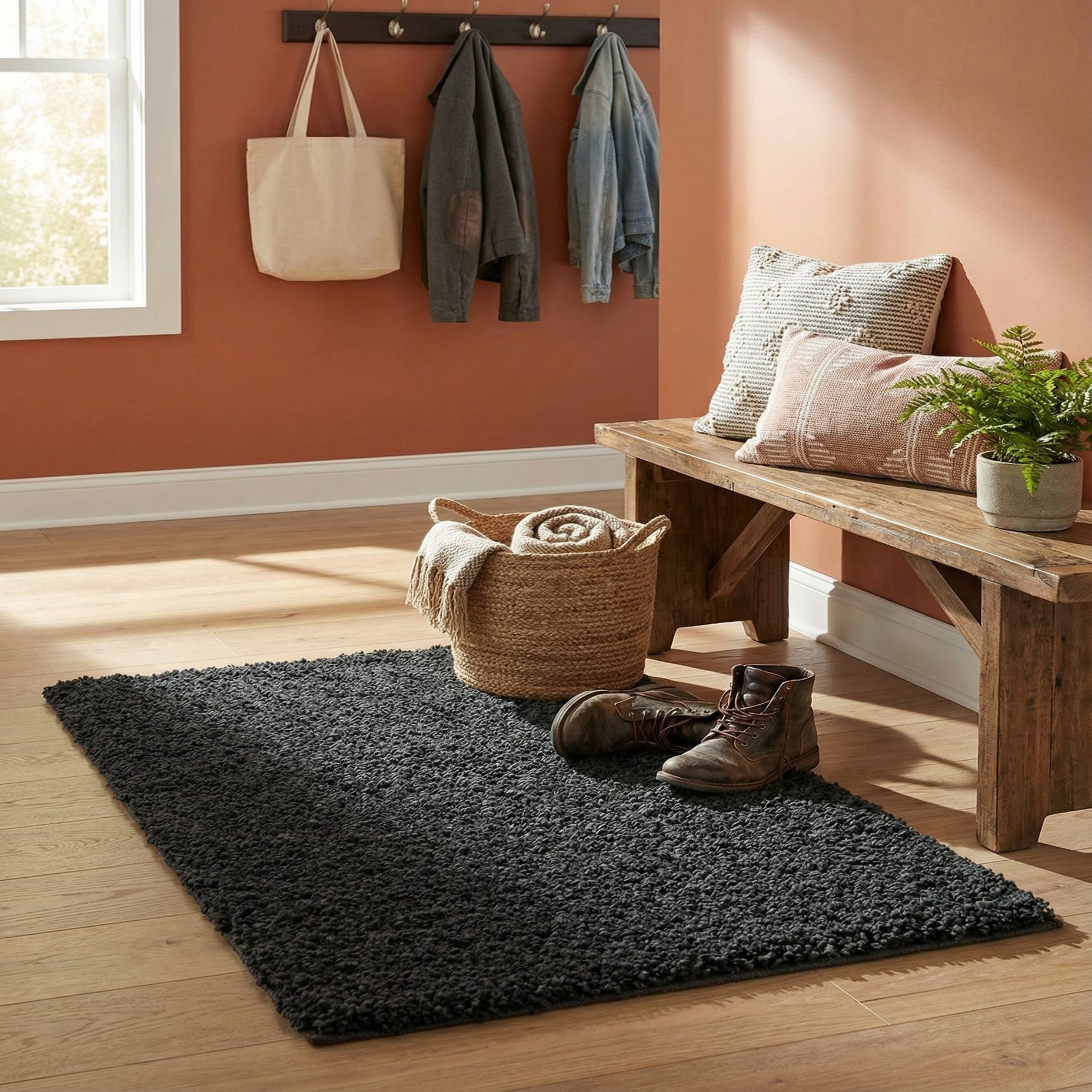 Run your fingers across the pile and you feel a soft, cushiony surface that holds its shape while offering a relaxed, cozy presence underfoot. This piece works well as an accent in small spaces—layered over a larger rug, set beside a bed, or placed at an entry or bathroom vanity—and pairs nicely with warm wood tones, leather seating, and matte metal accents for modern, industrial, or minimalist interiors.