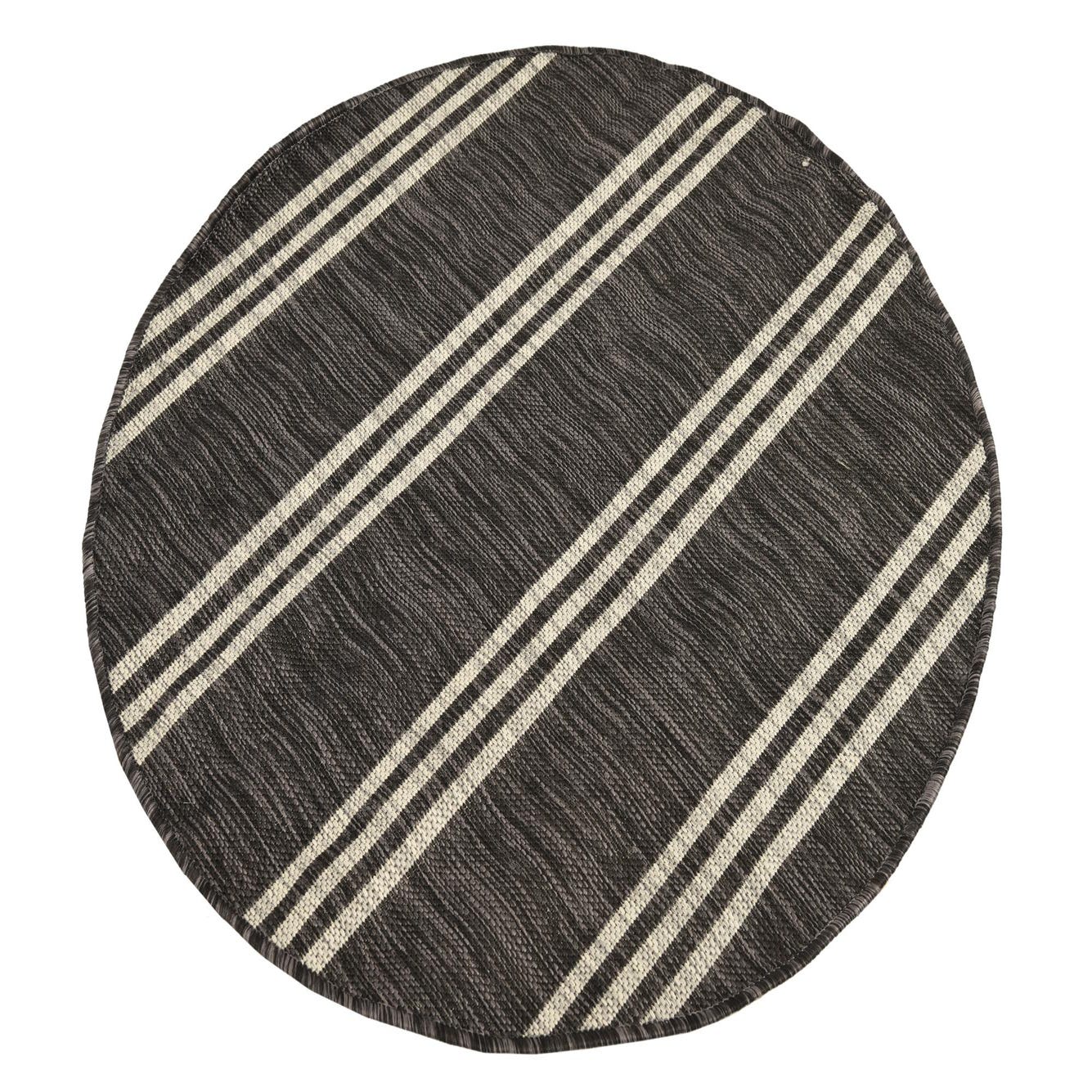 A low-profile, woven stripe rug in a charcoal ground with narrow gray banding for a clean, linear look. The design pairs closely spaced, double-stripe accents with a subtly variegated pile that gives the surface visual texture without added height. Machine-made from 100% polypropylene, the weave feels firm and slightly textured underfoot, with neatly finished edges that keep the round silhouette crisp.