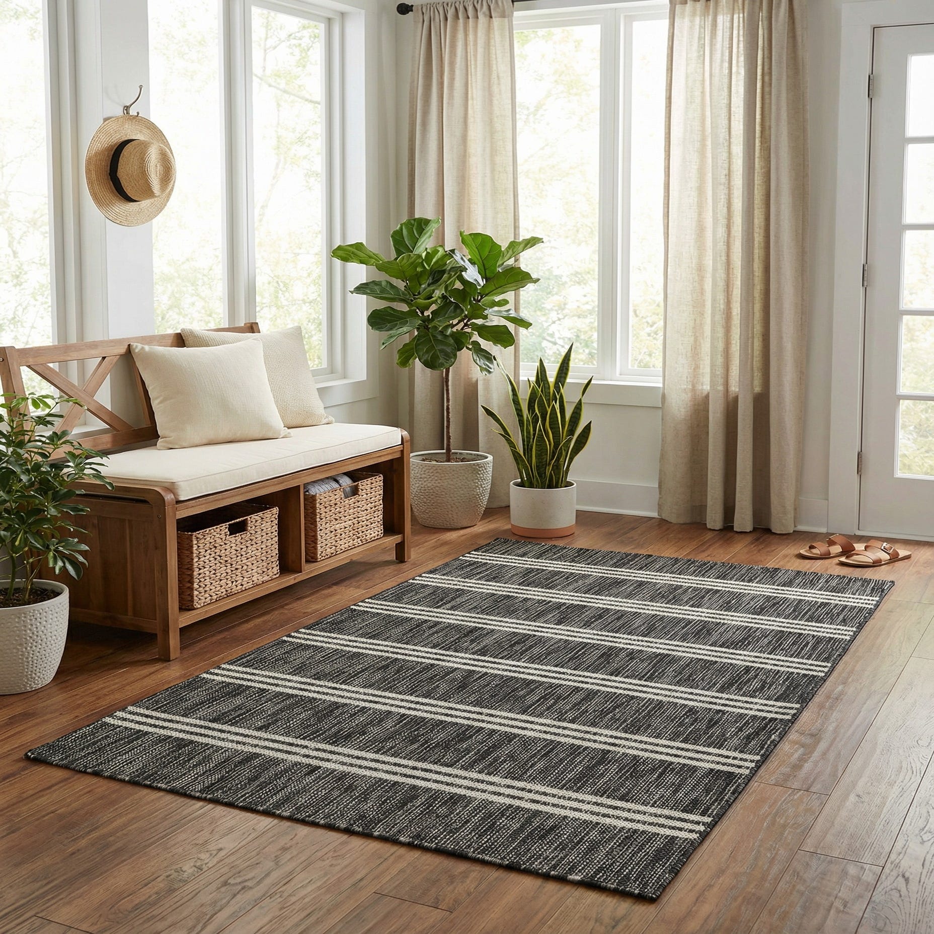 Clean, linear banding crosses a rich charcoal ground in this machine-made rug crafted from 100% polypropylene. A closely woven, heathered charcoal and gray weave gives the surface visual depth while maintaining a low-profile, flatwoven texture that feels firm and slightly textured underfoot. Three narrow gray stripes repeat across the field, their crisp lines contrasting with the more organic striations of the background for a contemporary, structured look.