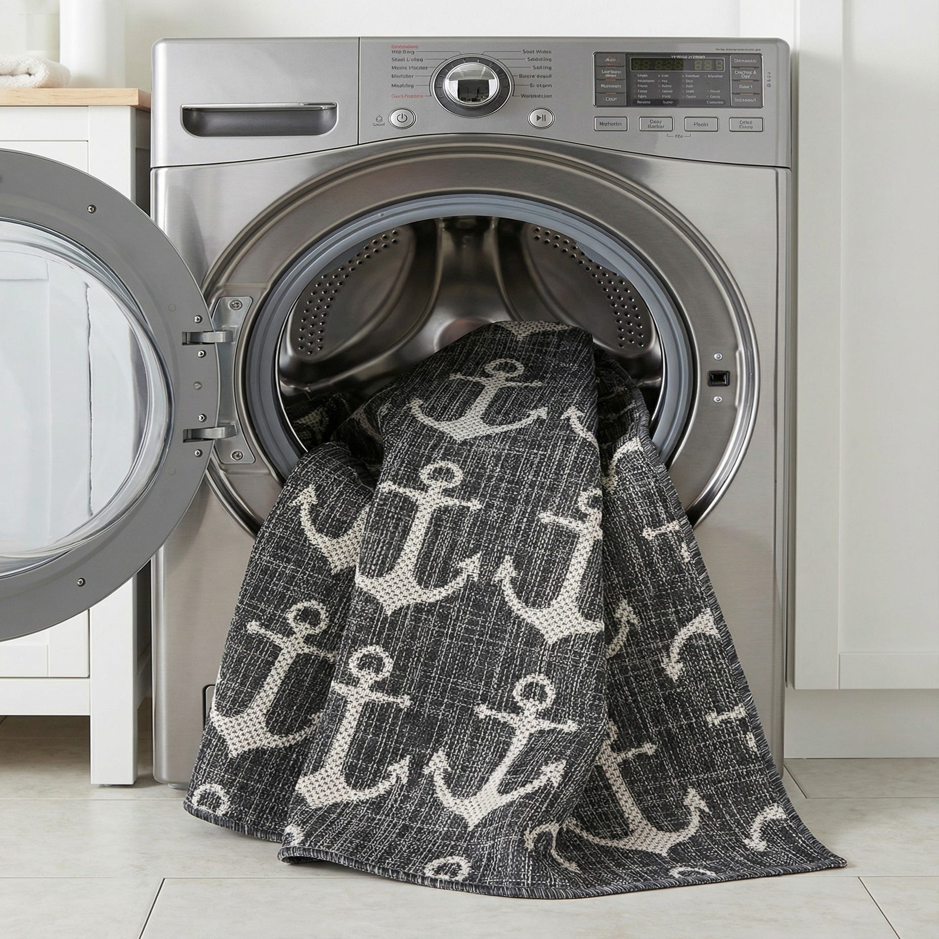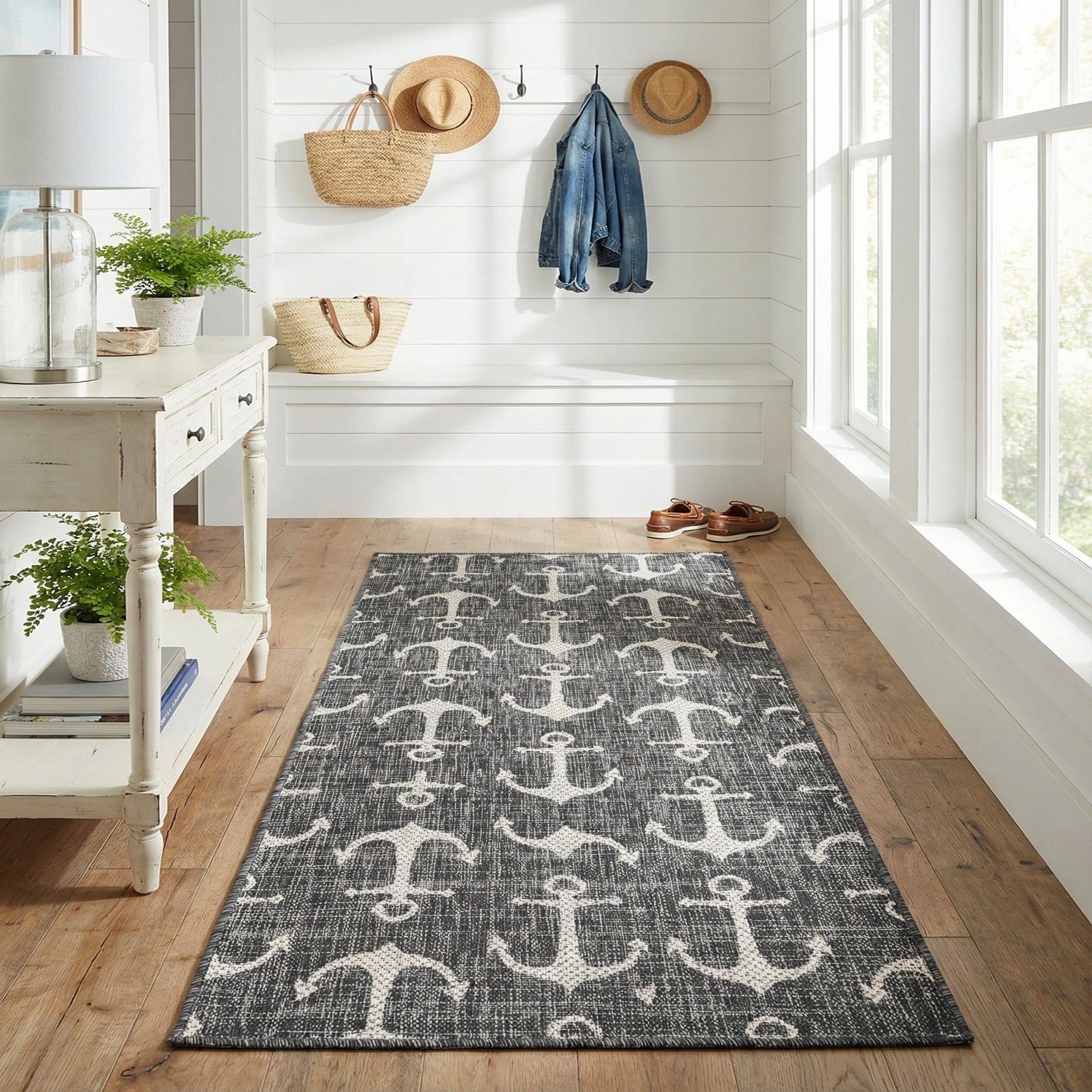 A 3x5 rectangular black and gray coastal rug with a repeating white anchor pattern, suitable for indoor or outdoor use.