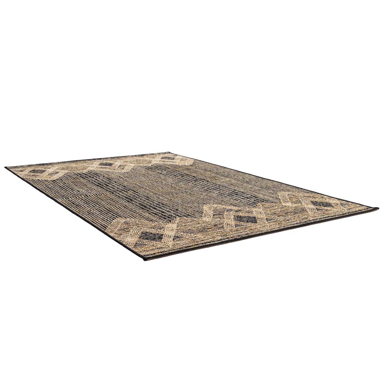 A 3x5 rectangular black and gold modern flatweave rug with a textured striped center and geometric diamond borders, suitable for indoor or outdoor use.