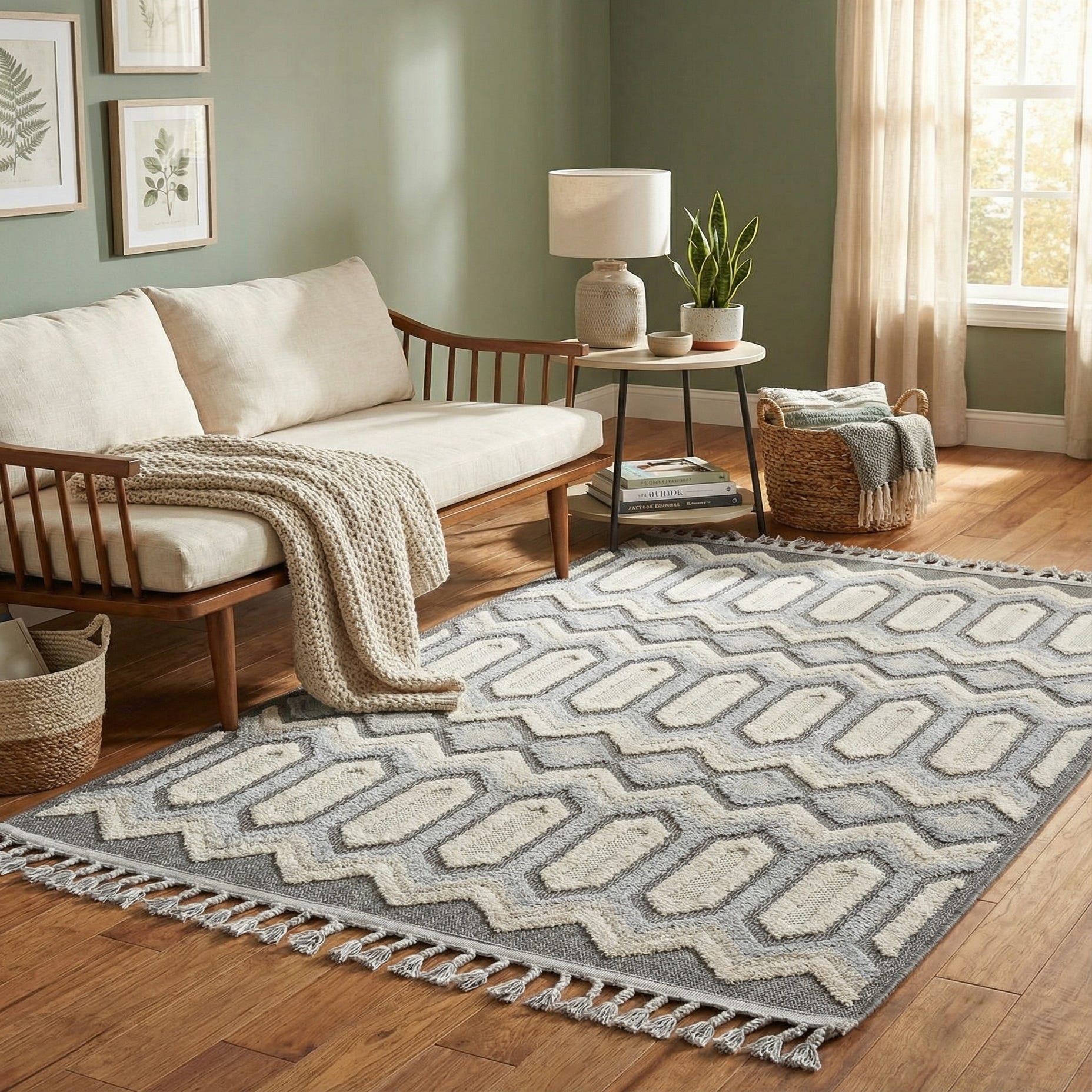 Pairs naturally with modern and transitional interiors—place it under a small seating arrangement, in an entryway, or at the foot of a bed to define a zone and introduce pattern without heavy color. It complements light wood or painted furniture, metal or matte-black fixtures, and neutral upholstery, and provides a strong contrast in softer, warmer schemes thanks to the Charcoal background and muted Beige and Gray palette.