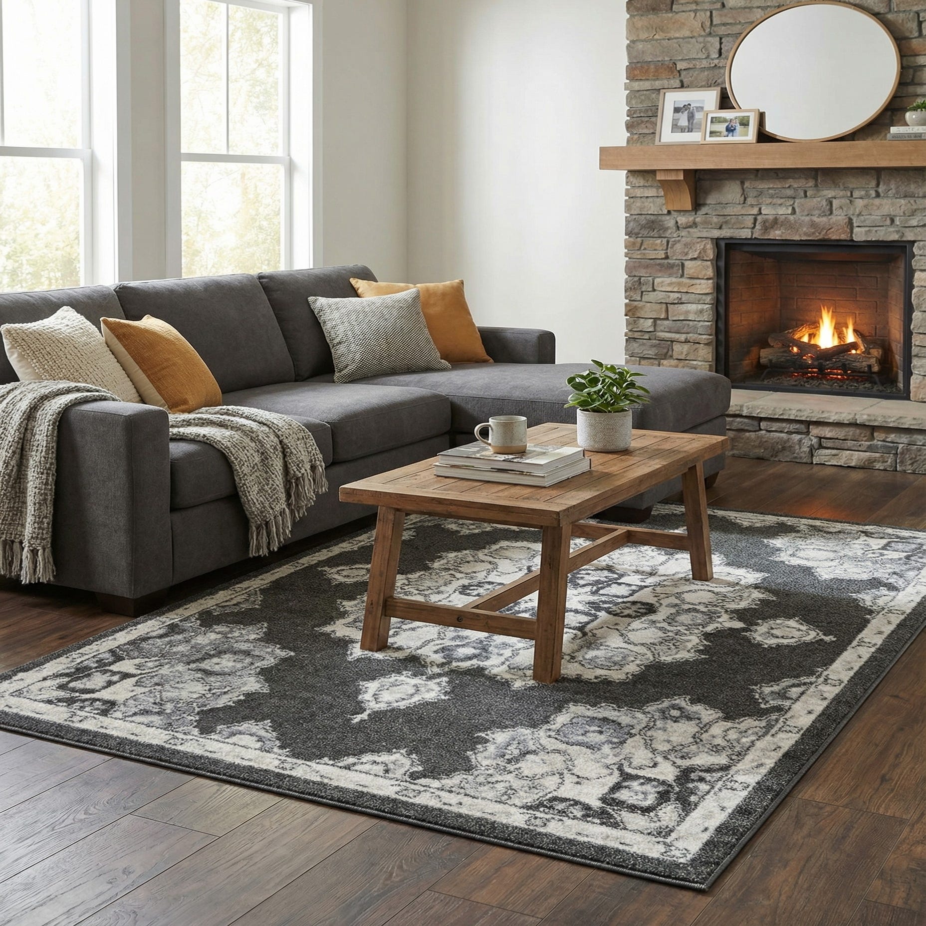 Machine-made from 100% polypropylene, this rug has a low, even pile that feels soft underfoot while keeping the pattern crisp. It works well layered under a coffee table in a neutral living room, as a grounding piece in a modern farmhouse or transitional dining area, and in an entry or office where a darker background helps conceal everyday wear. Pair it with light wood or metal furniture and textured throws or pillows in gray and ivory to reinforce the rug’s calm, collected palette.