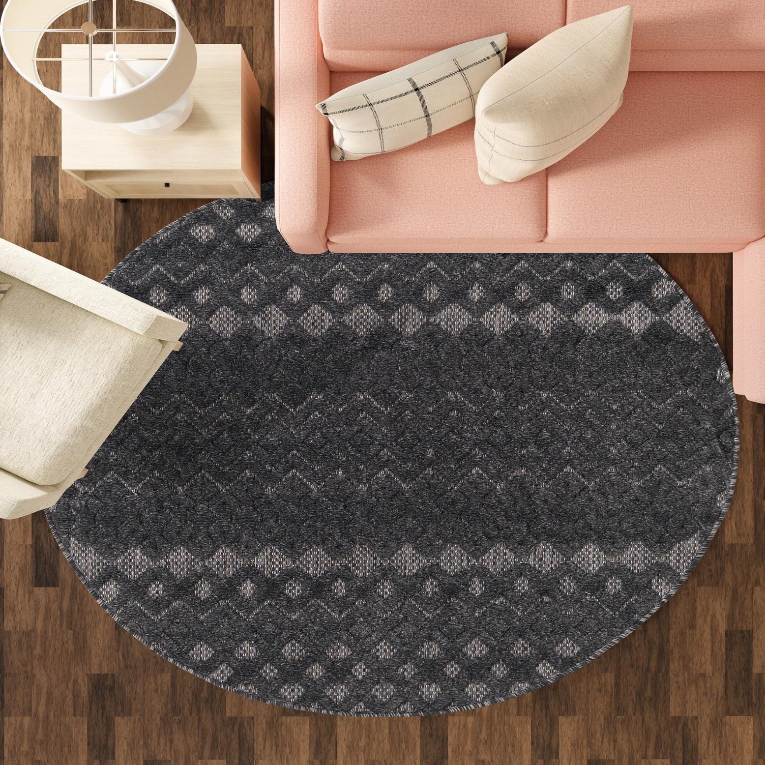 This round design works well tucked beneath a bistro table on a covered patio, centered under a small round dining table, or placed in a cozy entryway to add structure without overwhelming a compact space. The charcoal tone pairs easily with metal and wood furnishings, suiting modern, industrial, and monochrome decor schemes, and it layers neatly over a larger neutral rug for added pattern and texture.