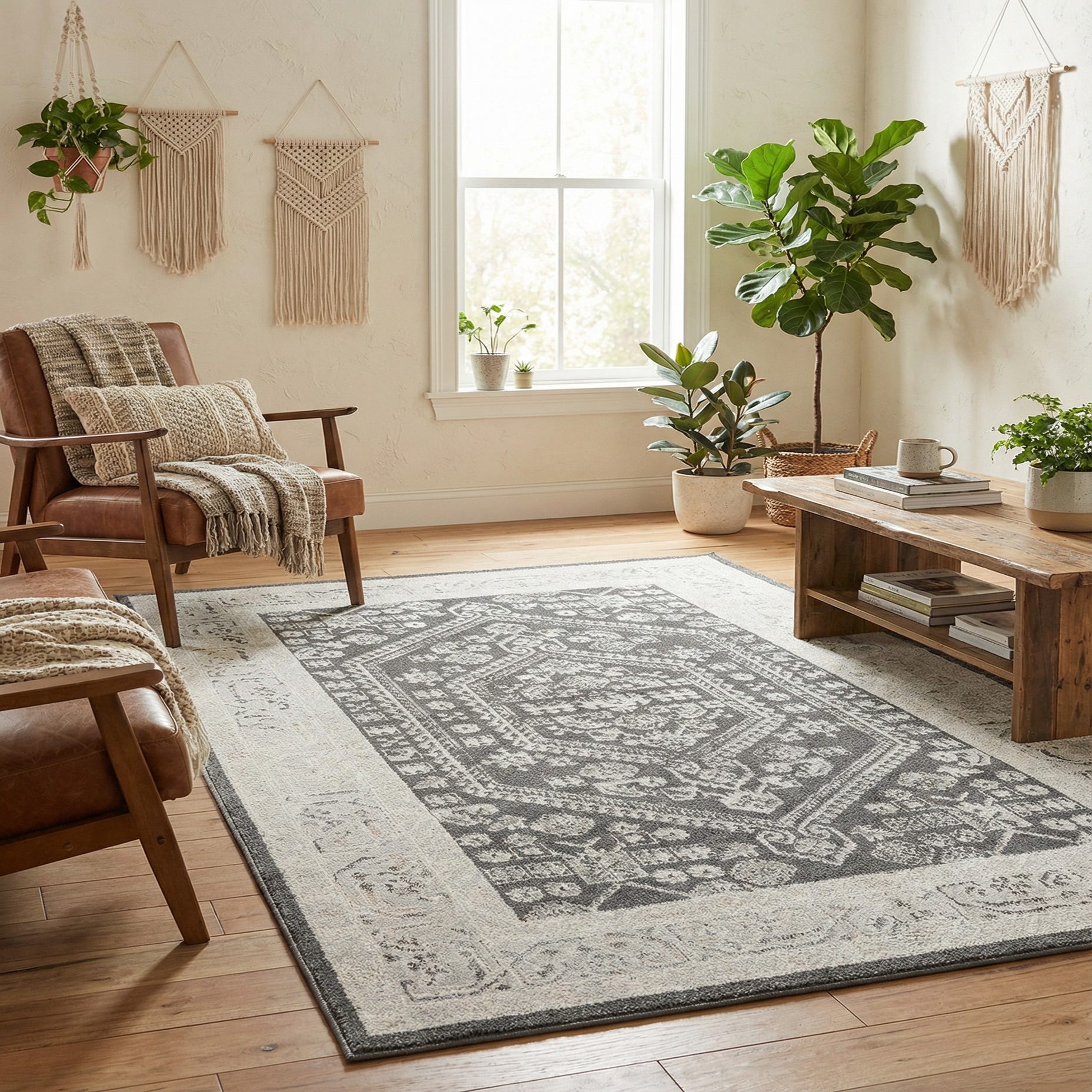 A vintage-inspired medallion rug with a charcoal background, this machine-made piece pairs classic ornamentation with a subtly distressed finish. The central geometric medallion and surrounding floral and square motifs are rendered in ivory with accents of black, creating a layered, lived-in look. A broad ivory border edged in black frames the design, while the low, dense polypropylene pile feels smooth underfoot with a slight cushioned give that highlights the pattern’s crisp lines and softly faded details.