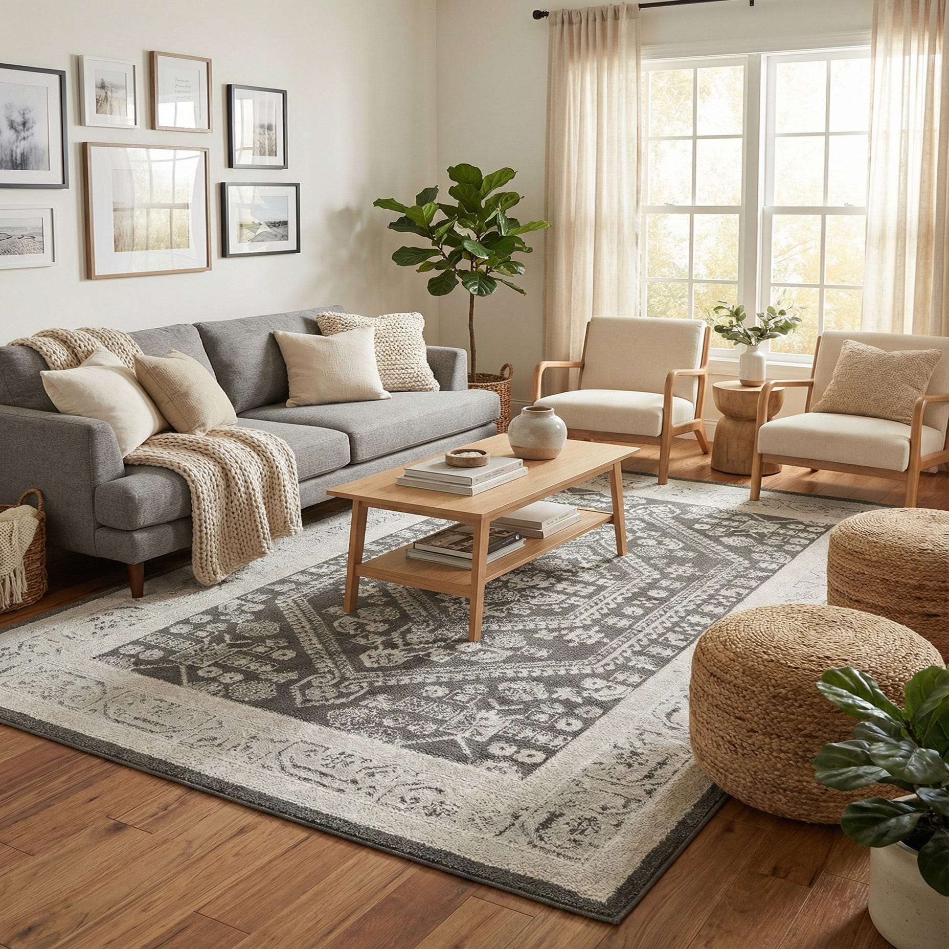 Made from 100% polypropylene, the rug offers consistent color and construction suitable for everyday rooms. Use it to anchor a living room seating group beneath neutral sofas, add contrast under a dining table, or layer in an entryway to set a calm, grounded tone. It pairs especially well with warm wood finishes, matte black metal accents, and soft gray upholstery for transitional, modern farmhouse, or industrial interiors.