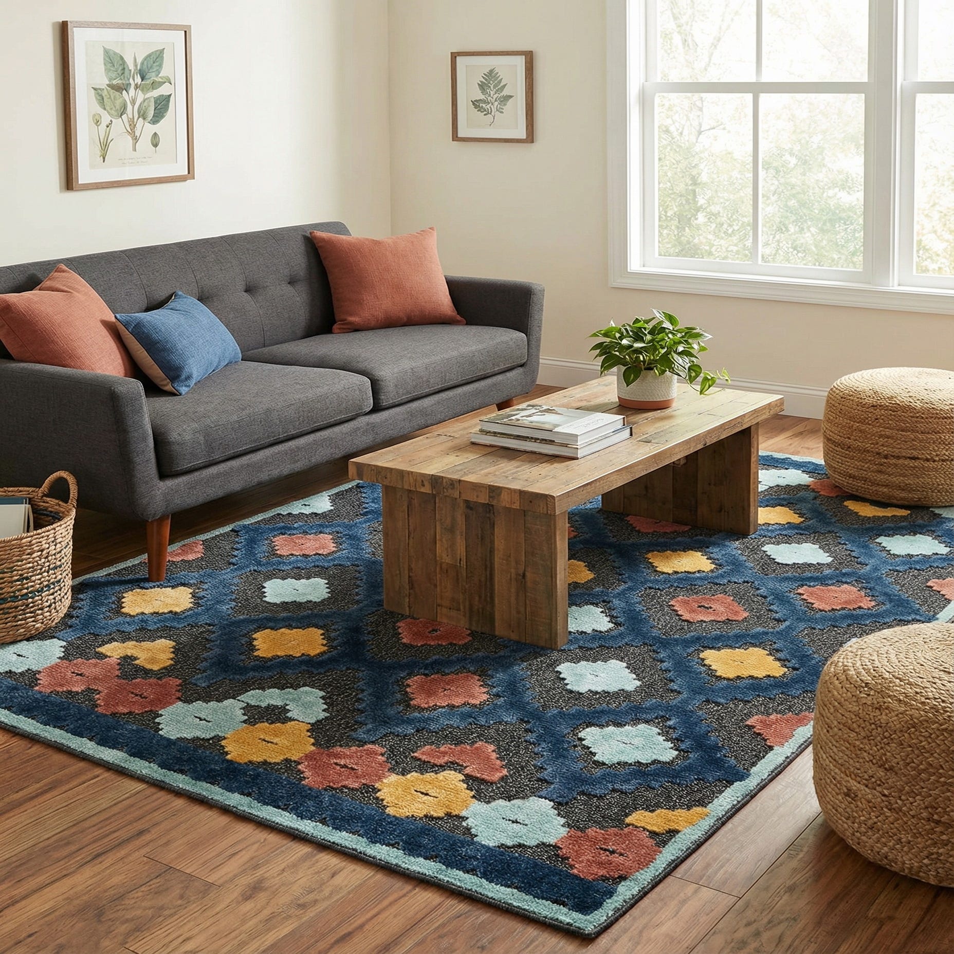 A 5x8 rectangular black and blue rug with a bohemian trellis pattern featuring colorful diamonds in teal, rust, and gold.