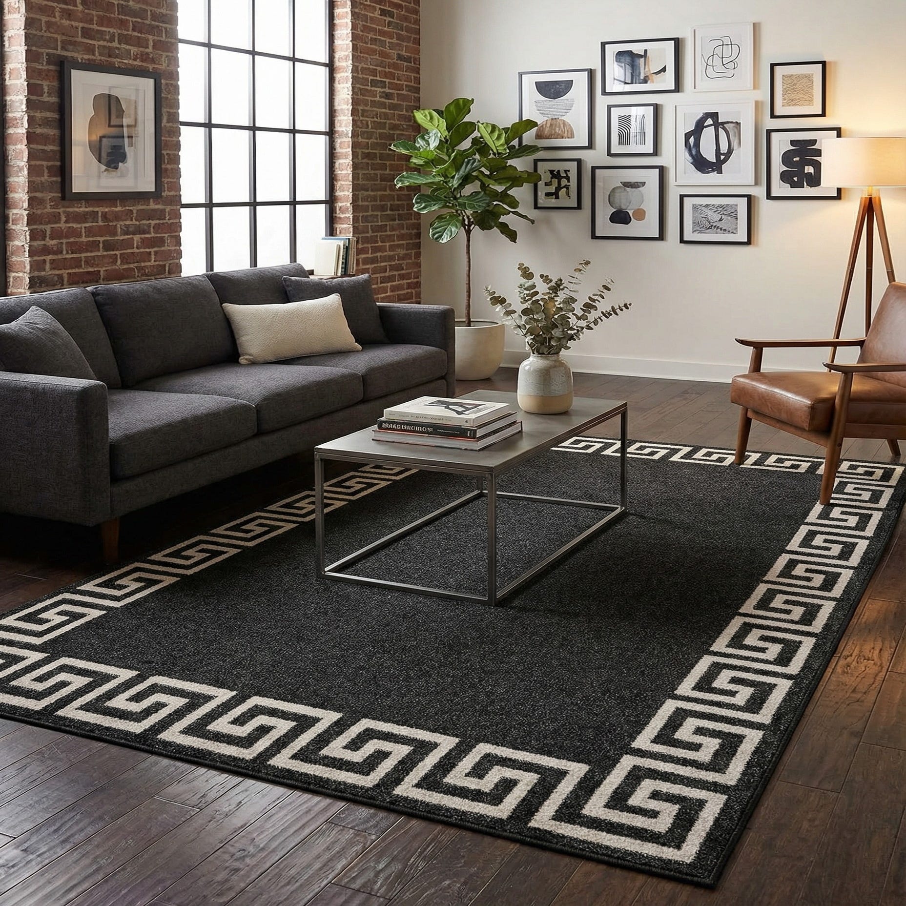 A deep charcoal field anchors this rug while a crisply rendered Greek key border in beige and black creates a strong architectural frame. The clean geometric pattern reads modern with classic roots, offering straightforward visual structure without fuss. Machine made from 100% polypropylene, the rug has a dense, low-profile pile that feels smooth underfoot and offers a slight cushion—substantial enough to add warmth but low enough for easy furniture placement.