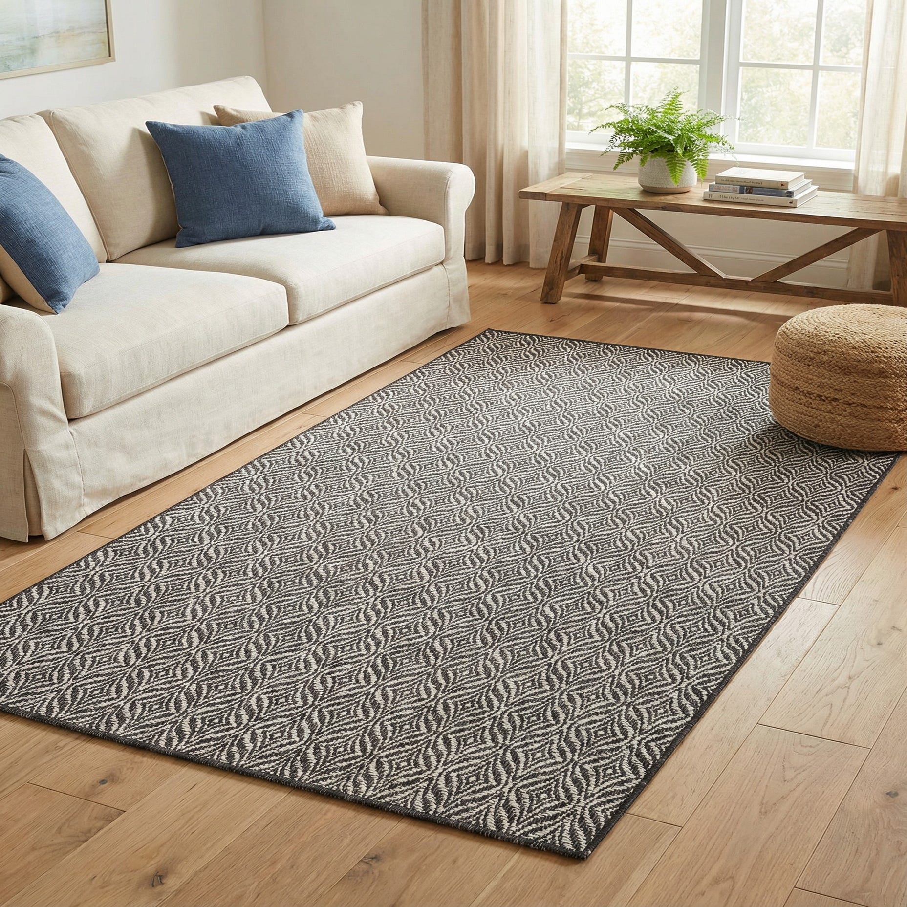 This piece works well on a covered patio or sunroom where the charcoal background anchors outdoor seating, and it also translates smoothly to indoor spaces like an entryway, casual dining area, or living room with modern or transitional furnishings. Pair it with natural wood tones, black metal accents, and light linens to emphasize contrast, or layer it beneath a slim console or a compact dining set to define and unify a seating area.