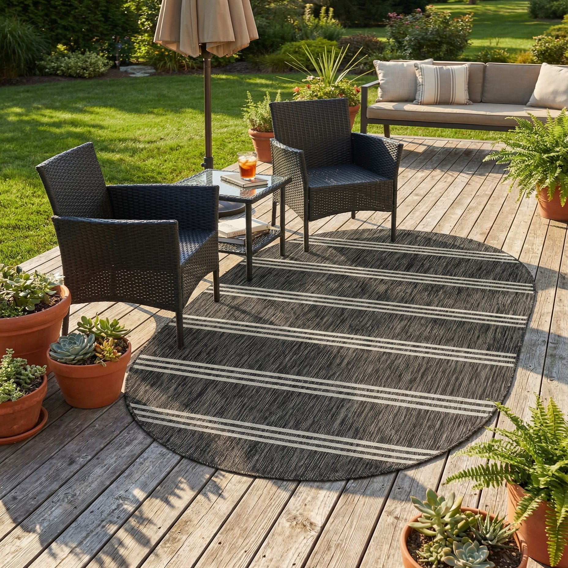 Oval black and gray striped indoor/outdoor rug with a textured flatweave, ideal for a patio.