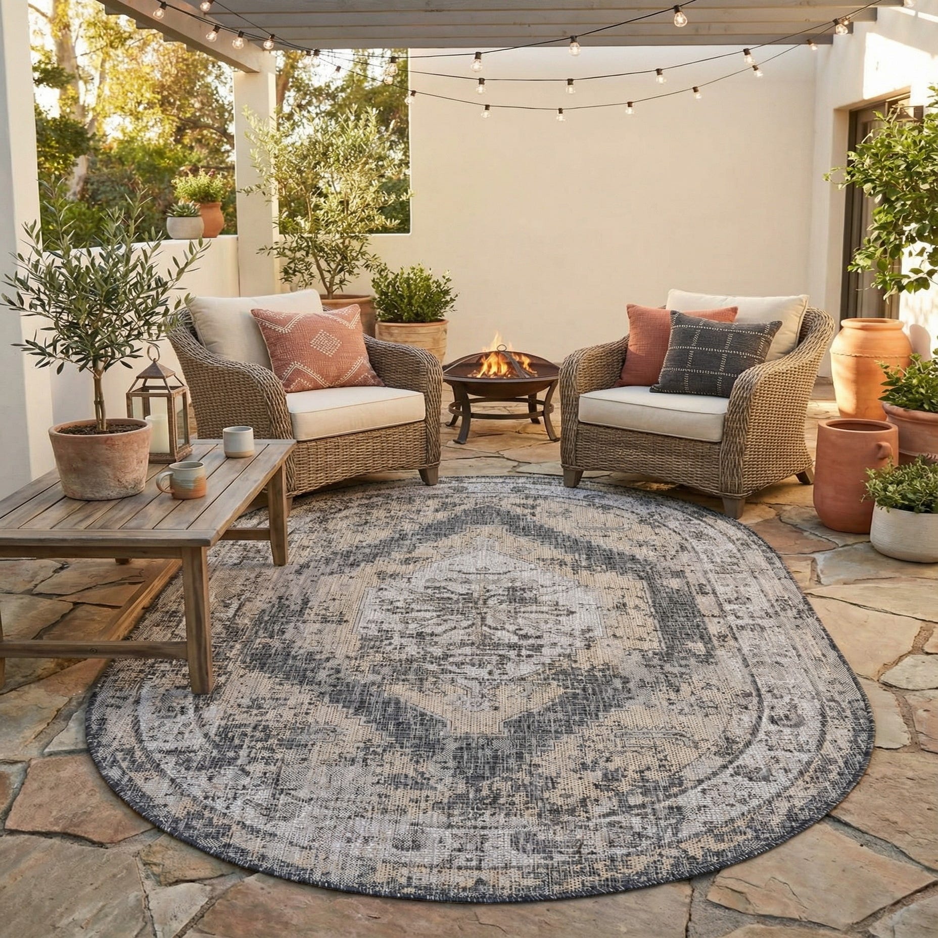 Well-suited for covered patios, a bistro or dining nook, and entryways, this piece brings pattern and grounding tone to both indoor and outdoor settings. Pair it with metal and reclaimed wood for an industrial-meets-vintage scheme, neutral upholstery for a transitional living area, or weathered wicker and light linens on a porch for a relaxed, layered look. The oval shape works particularly well under round or curved furniture arrangements, such as a circular dining set or a small seating vignette.