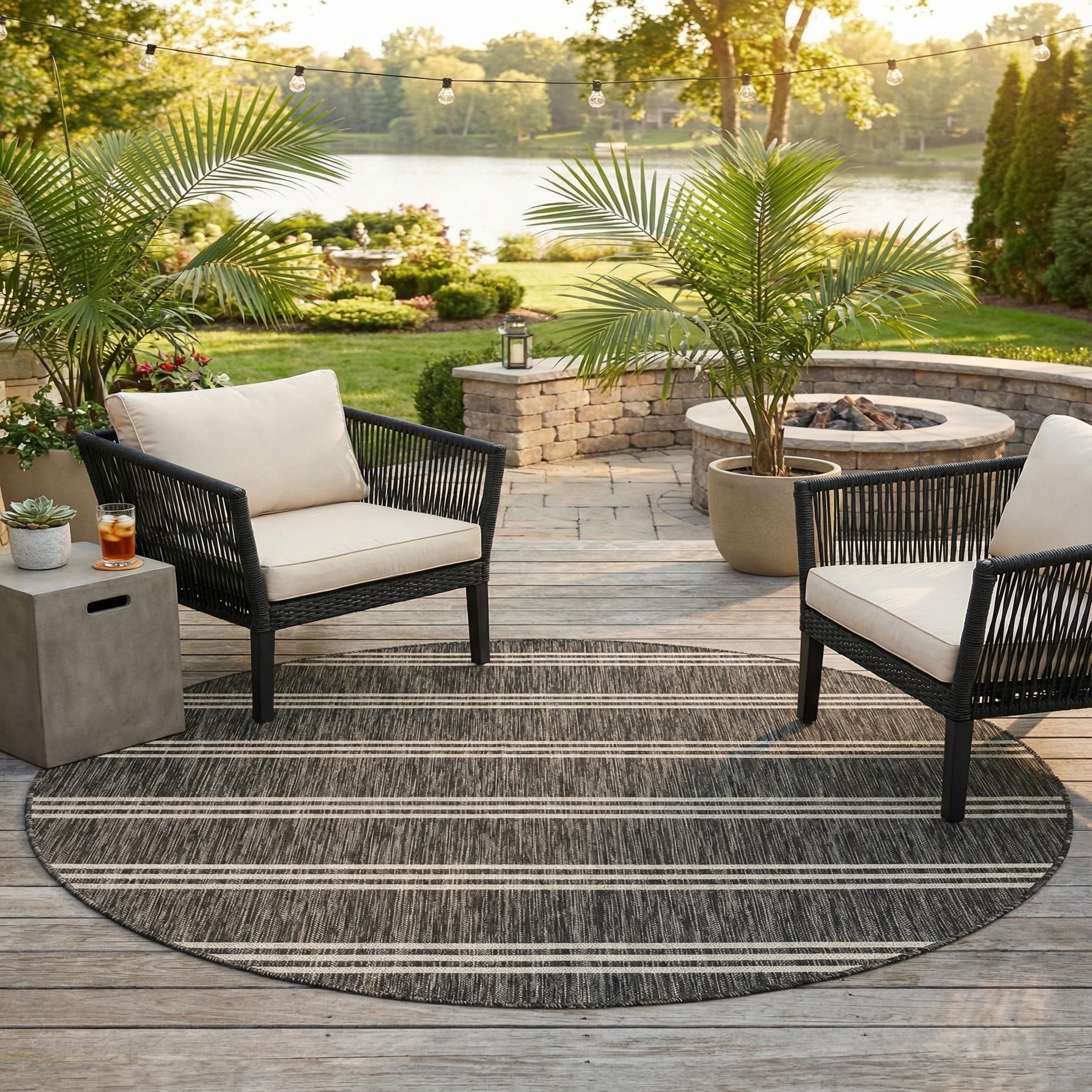 Machine-made from 100% polypropylene, this outdoor-ready piece works well on covered patios, balconies, sunrooms, or casual dining spots. Its charcoal and gray palette pairs naturally with light wood, metal or wicker furnishings and suits modern, coastal, or transitional interiors—ideal under a bistro set, centered beneath a small dining table, or placed by a doorway to anchor an outdoor living area.