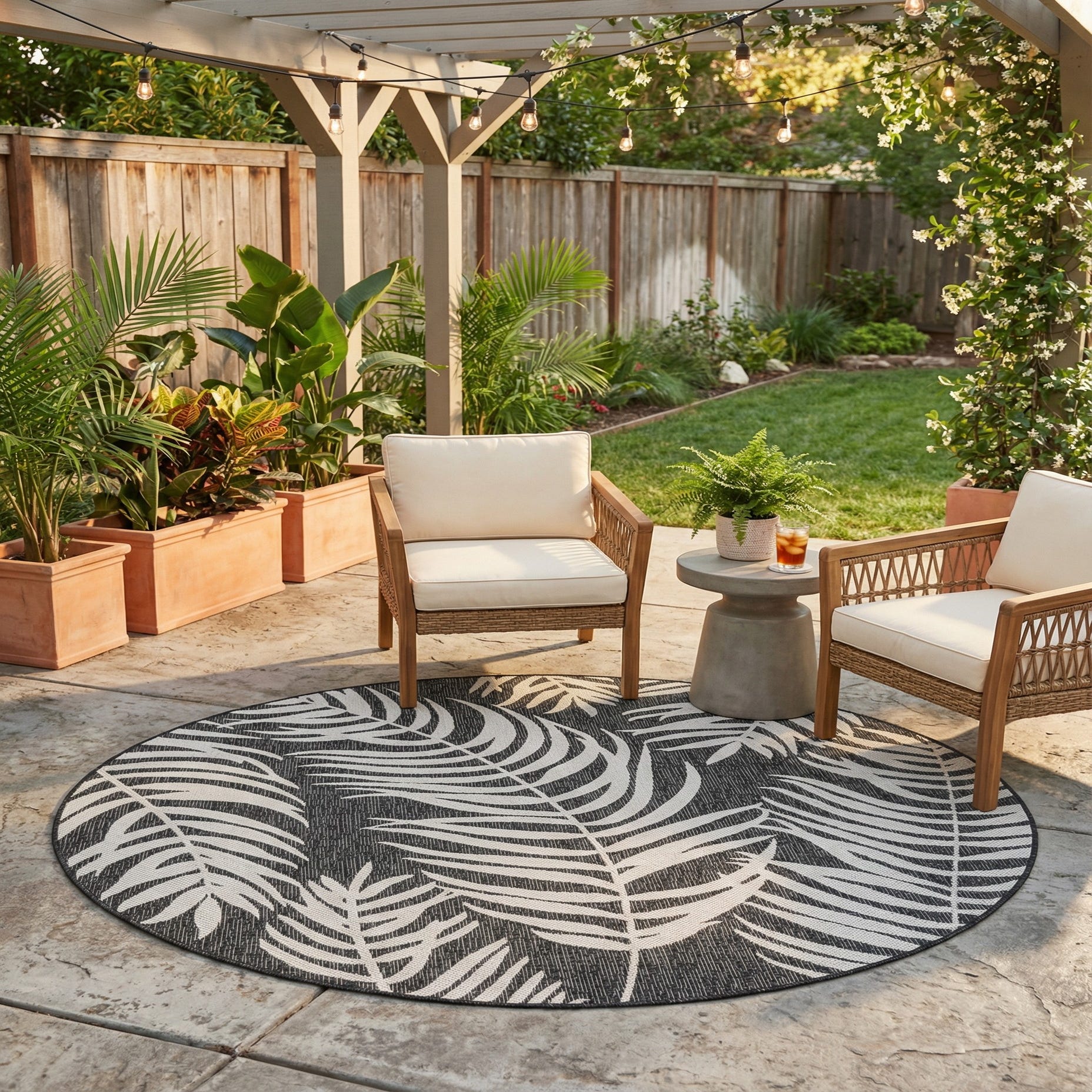 Place this rug to anchor a cozy outdoor seating area or a sunroom, or use it inside beneath a round dining table to introduce bold contrast. It pairs naturally with warm wood tones and woven rattan for a relaxed, natural feel, or with black metal and minimalist furniture for a more contemporary setting. The neutral charcoal and gray palette makes it easy to layer with bright cushions or keep a monochrome, sophisticated scheme.