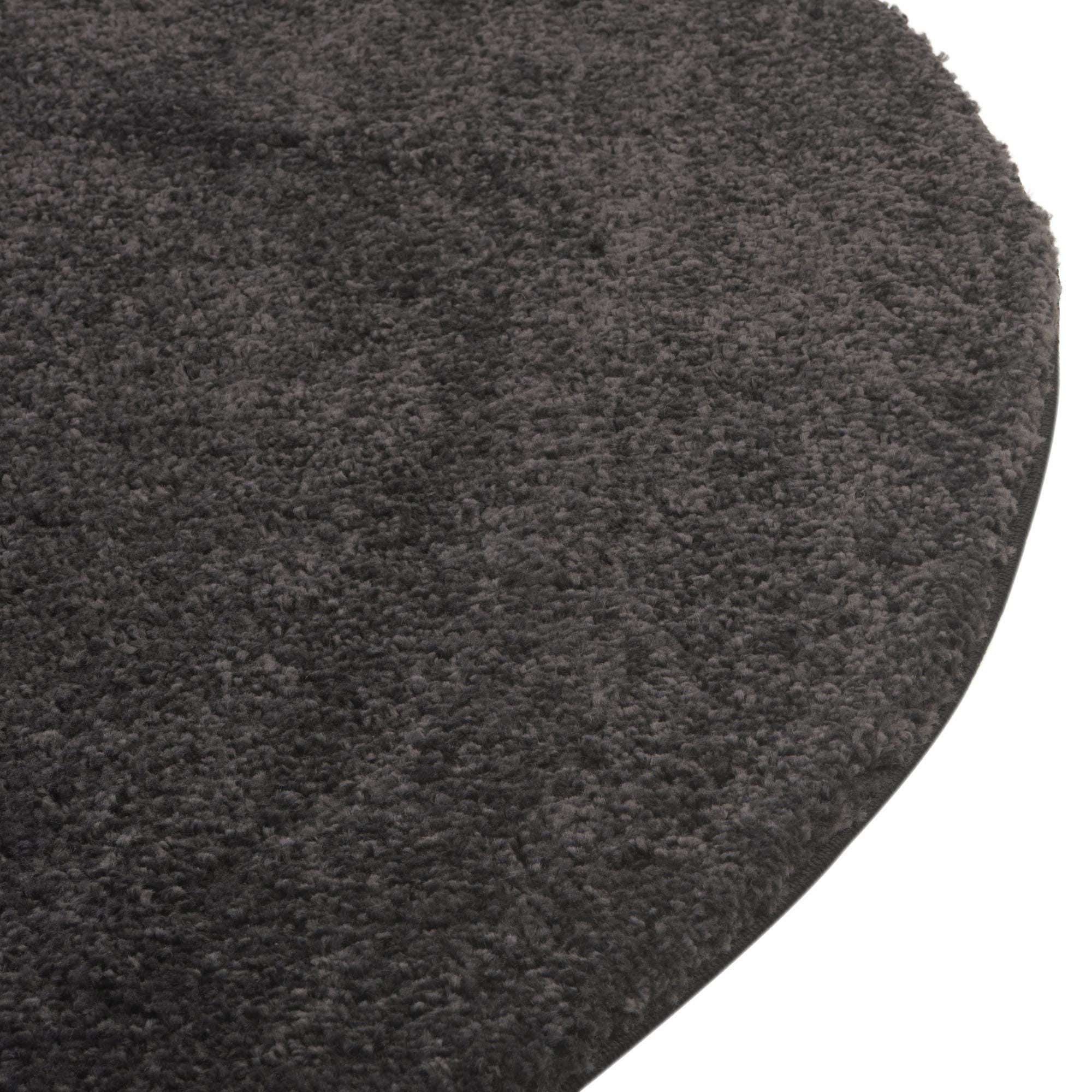 A deep charcoal round rug with a clean, solid surface punctuated by subtle tonal shifts of black and gray throughout the pile. The background is charcoal, and the closely packed fibers create a uniform field with gentle variations in tone rather than a printed pattern. Machine-made from 100% polypropylene, the construction delivers a consistently even finish and a low-profile aesthetic that suits contemporary and transitional interiors.
