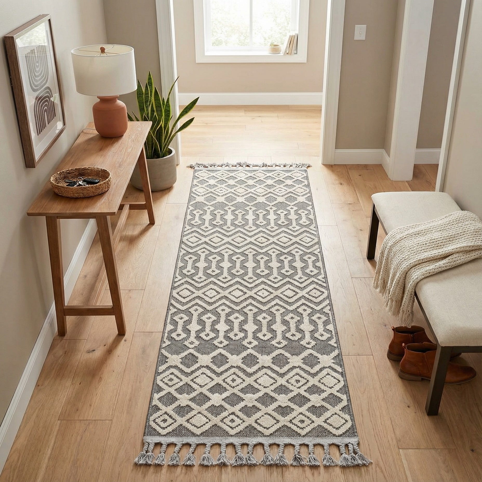 This runner brings quiet pattern and texture to narrow spaces — place it in a hallway, entry, kitchen galley, or alongside a bed to add visual interest without overwhelming the room. It pairs naturally with warm wood tones, black metal accents, neutral linens, and layered textiles in modern farmhouse, Scandinavian, or casual contemporary interiors.