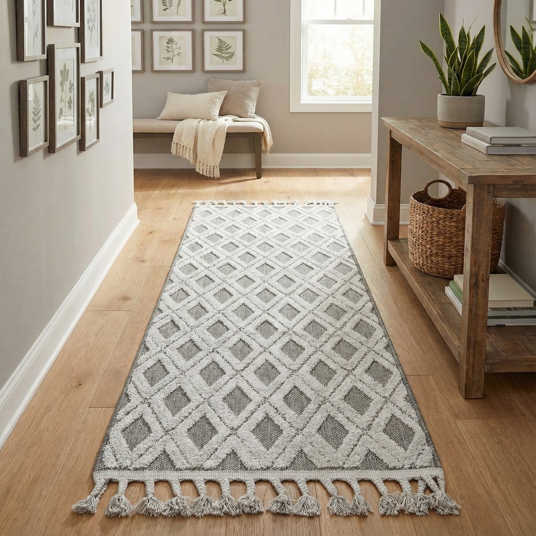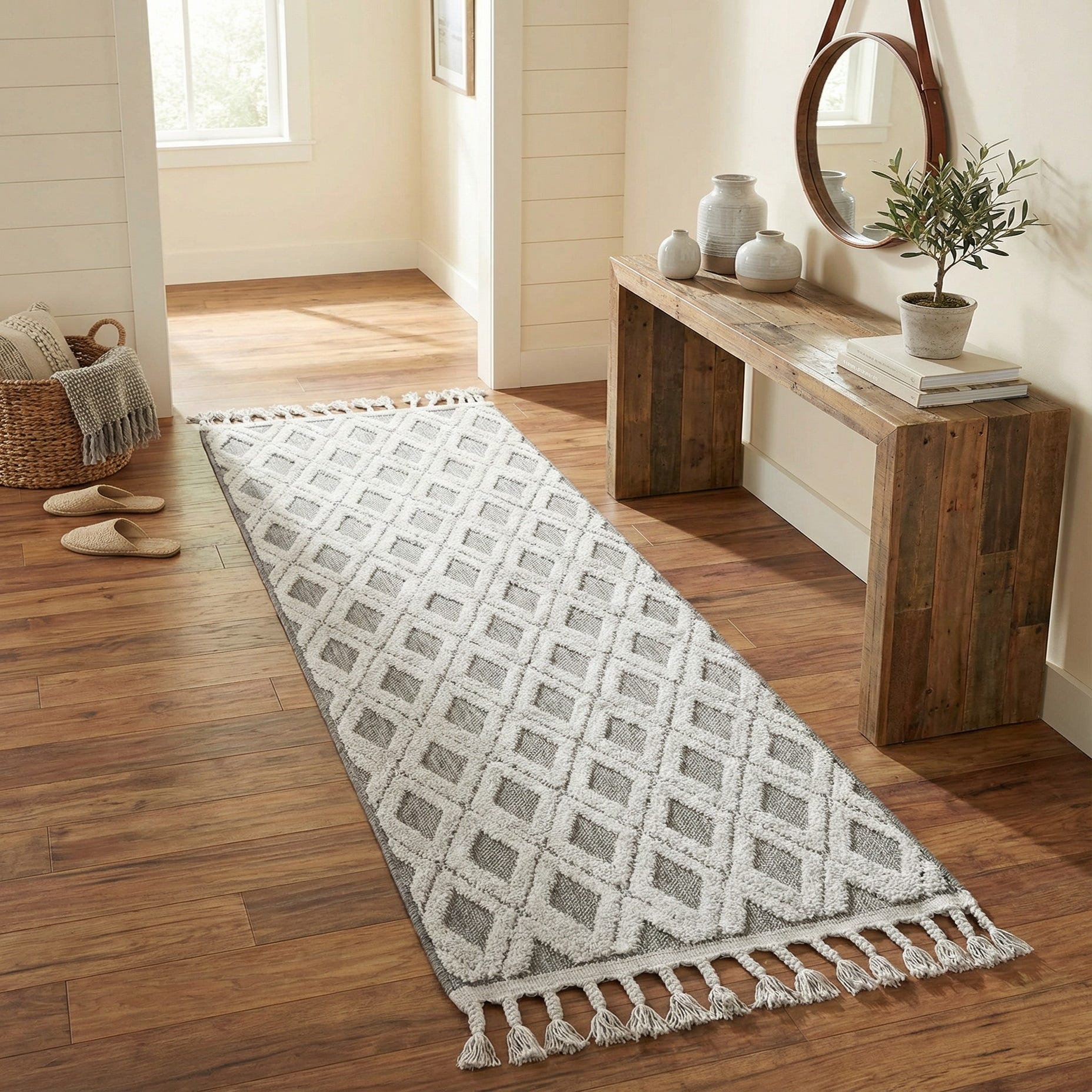 Machine-made of 100% polypropylene, the runner lays flat and adds cushioned texture where you need it most. The charcoal-and-gray palette works well with cool-toned schemes—matte black hardware, light oak floors, or white trim—and complements modern, Scandinavian, or transitional interiors. Use it in a hallway or entry to define traffic flow, in a galley kitchen to soften hard surfaces, or beside the bed to add warmth and pattern underfoot.