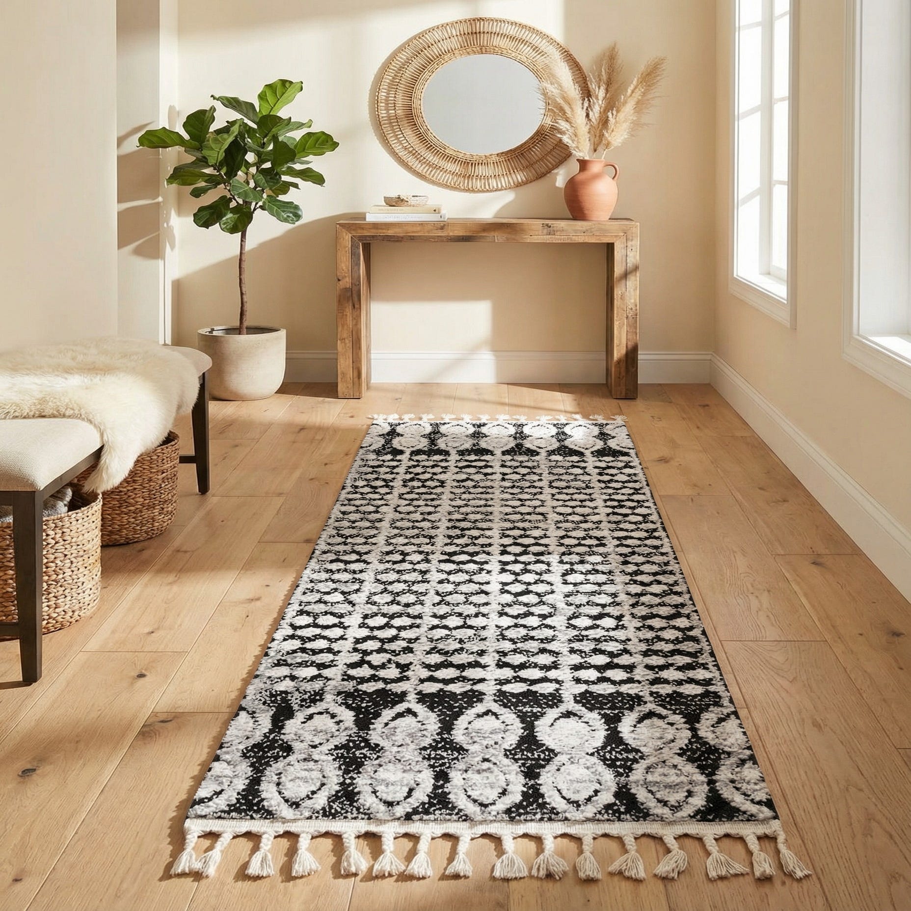 Place this runner in a narrow entryway or hallway to define circulation and add visual interest without overwhelming the space. It pairs naturally with modern monochrome schemes, Scandinavian-inspired interiors, or industrial lofts—think warm wood benches, black metal accents, and crisp white walls. The charcoal base also works well layered over a larger neutral rug or used to anchor a kitchen corridor or a long bedside run, bringing contrast and texture to transitional and contemporary settings.