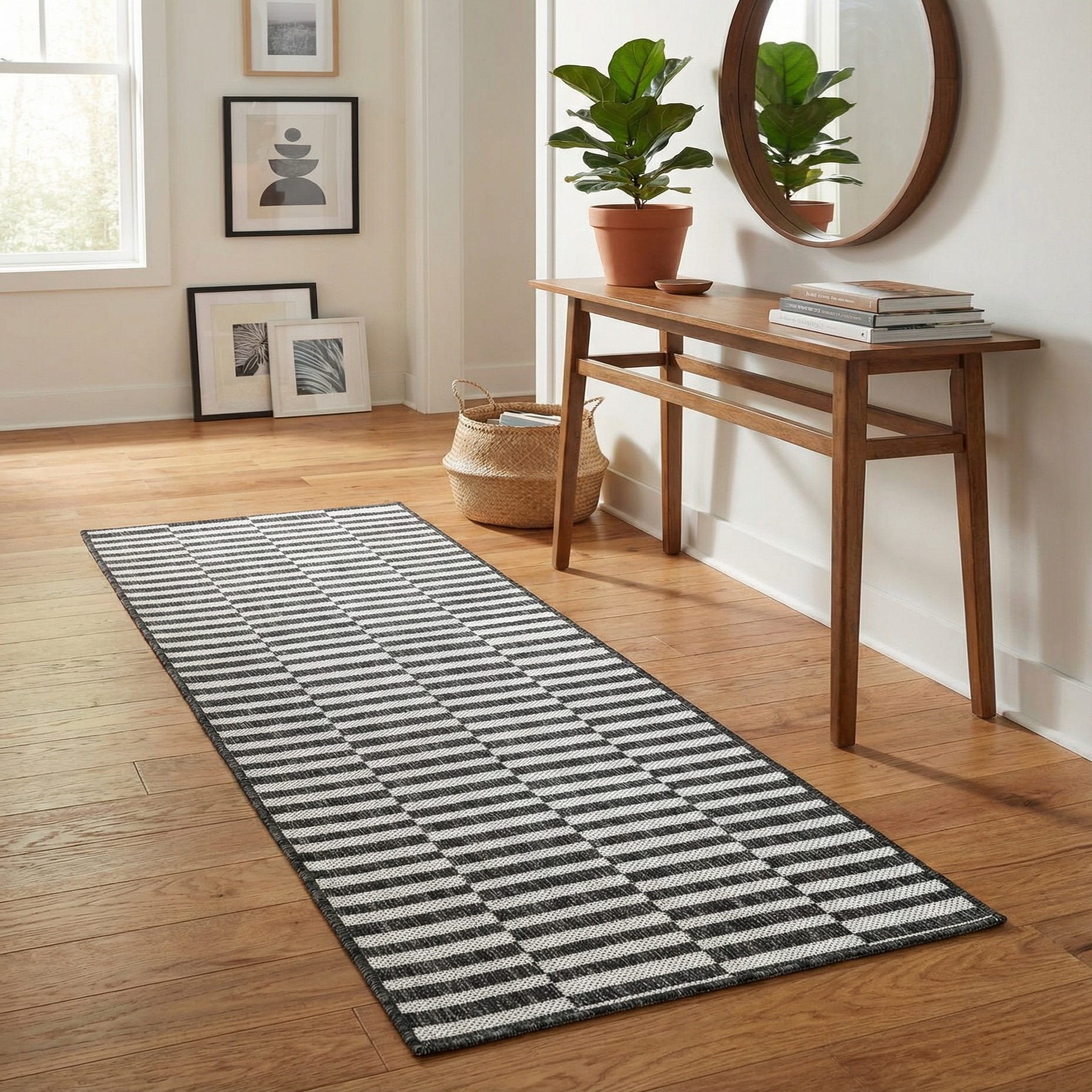 This runner works well in hallways and entryways, on a covered porch or balcony, and alongside kitchen islands where a durable, streamlined look is wanted. Pair it with warm wood flooring and matte black metal accents for an industrial-modern scheme, stack it beneath slender console tables in a minimalist foyer, or use it to add contrast in a light, Scandinavian-inspired space. The neutral charcoal, gray, and ivory palette makes it easy to layer with textured pillows, woven baskets, or crisp white furnishings.