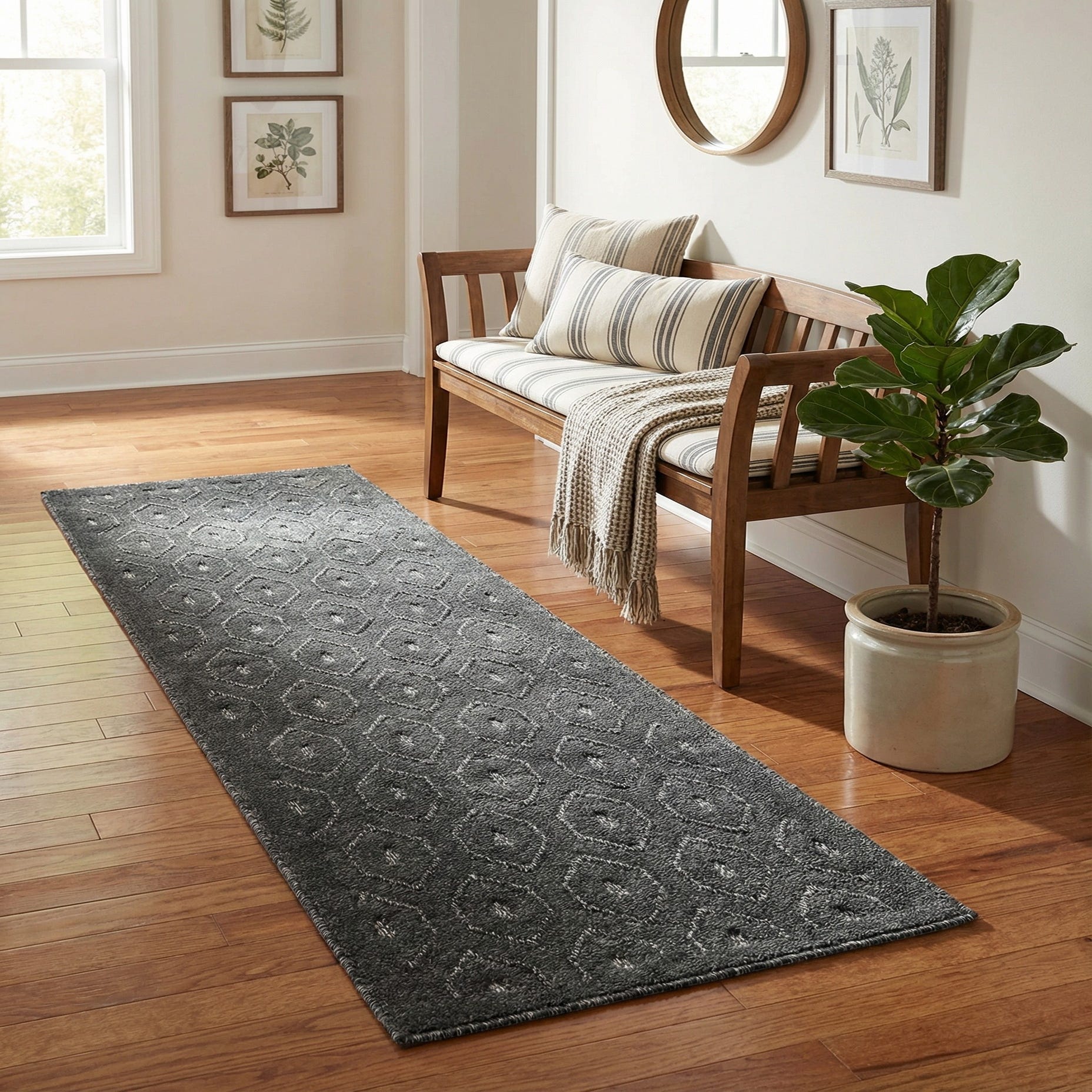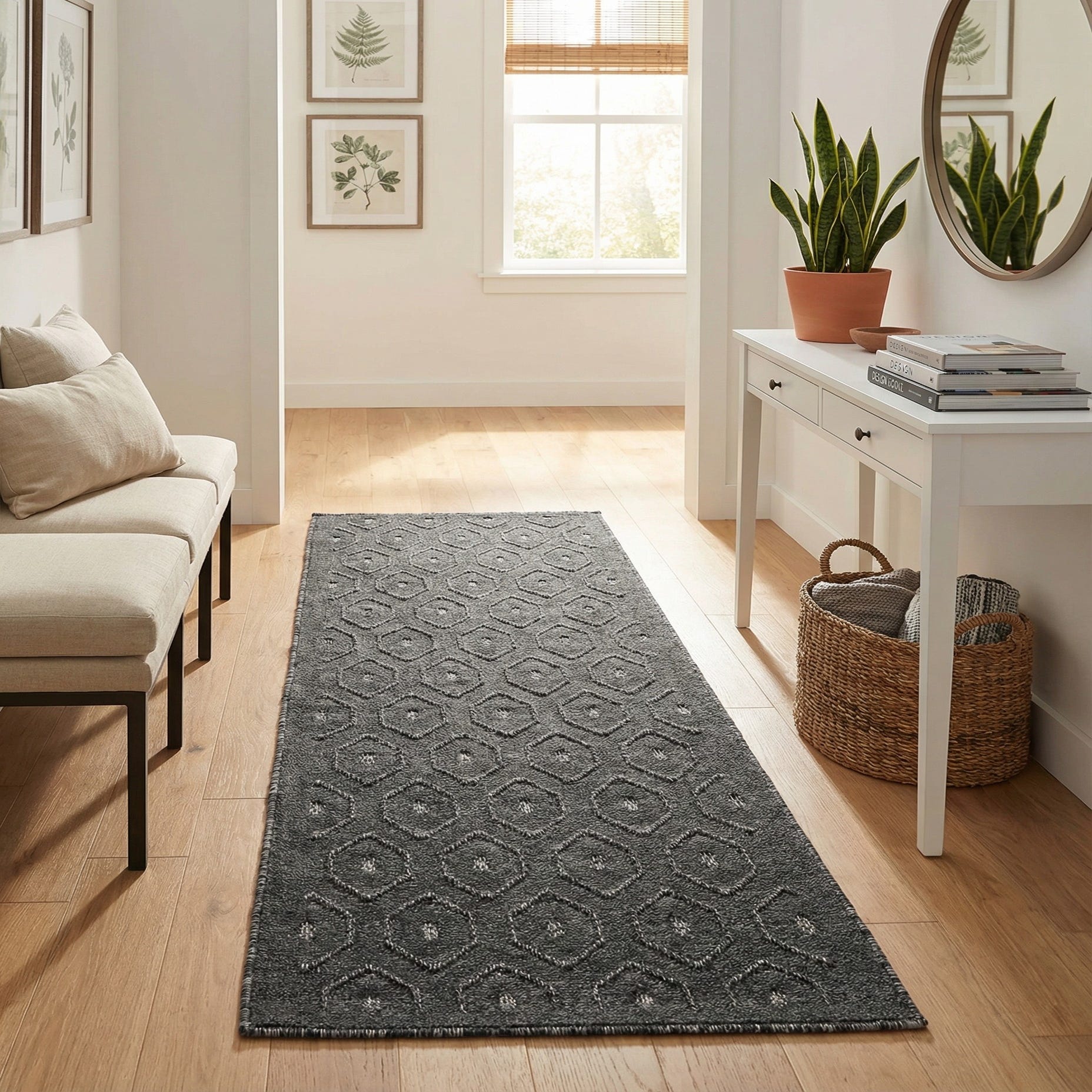 This runner works well in narrow, high-traffic zones such as entryways, hallways, or alongside a bed, and it also adapts to covered outdoor spaces. Pair it with light- to medium-toned woods and black metal accents for a contemporary look, or layer it beneath a console and woven baskets in a modern farmhouse or industrial-inspired entry. Its charcoal-and-ivory palette provides a neutral yet graphic anchor that complements both patterned and solid furnishings.