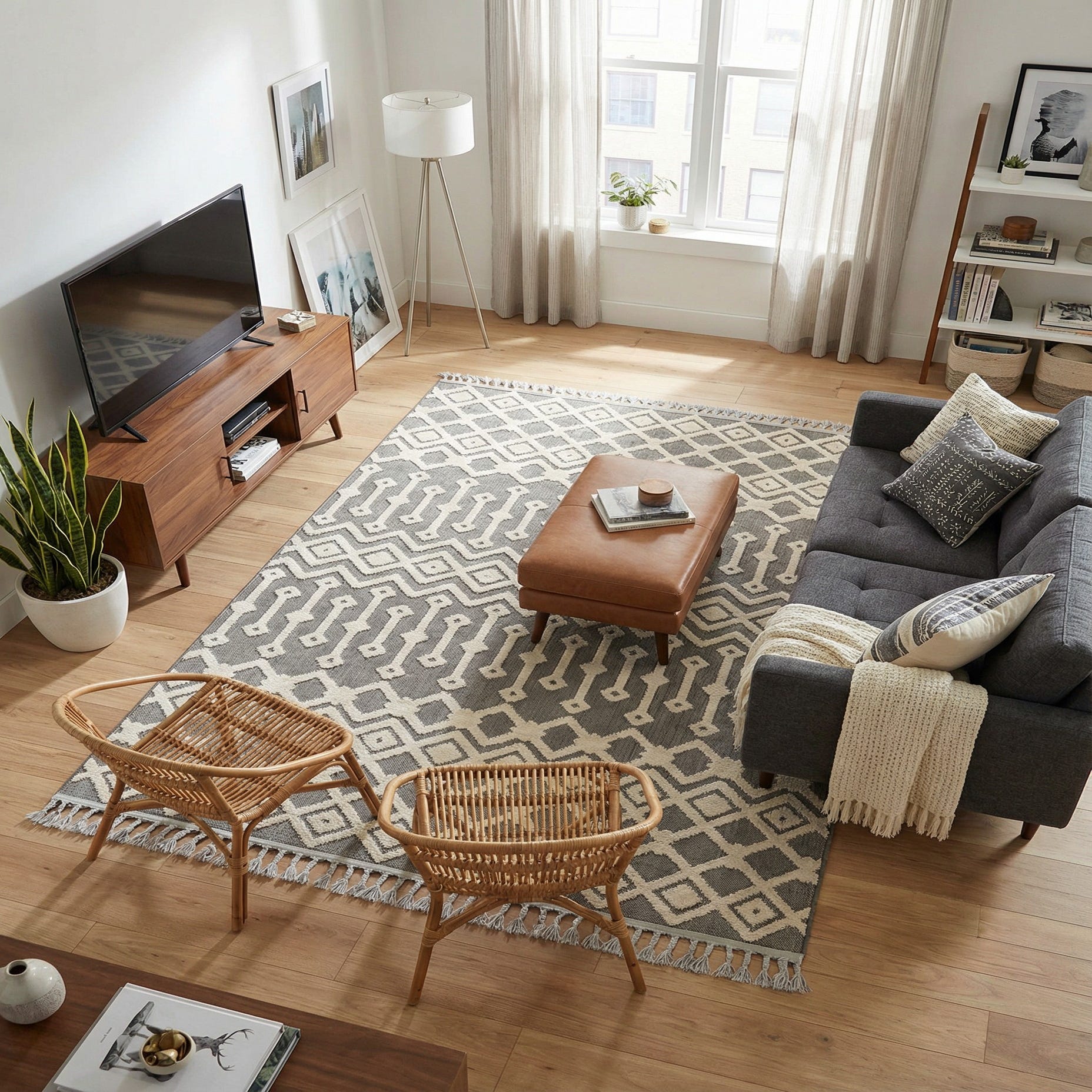 Machine-made from 100% polypropylene, the rug delivers the look of layered texture with an easygoing, low-pile feel that works well in everyday spaces. Use it to anchor a living room seating group, tuck it beneath a coffee table, or lay it in a bedroom to introduce pattern without overwhelming the room. It pairs naturally with light-wood or industrial metal furnishings, leather sofas, and neutral walls — and also complements modern farmhouse, transitional, and Scandinavian interiors.
