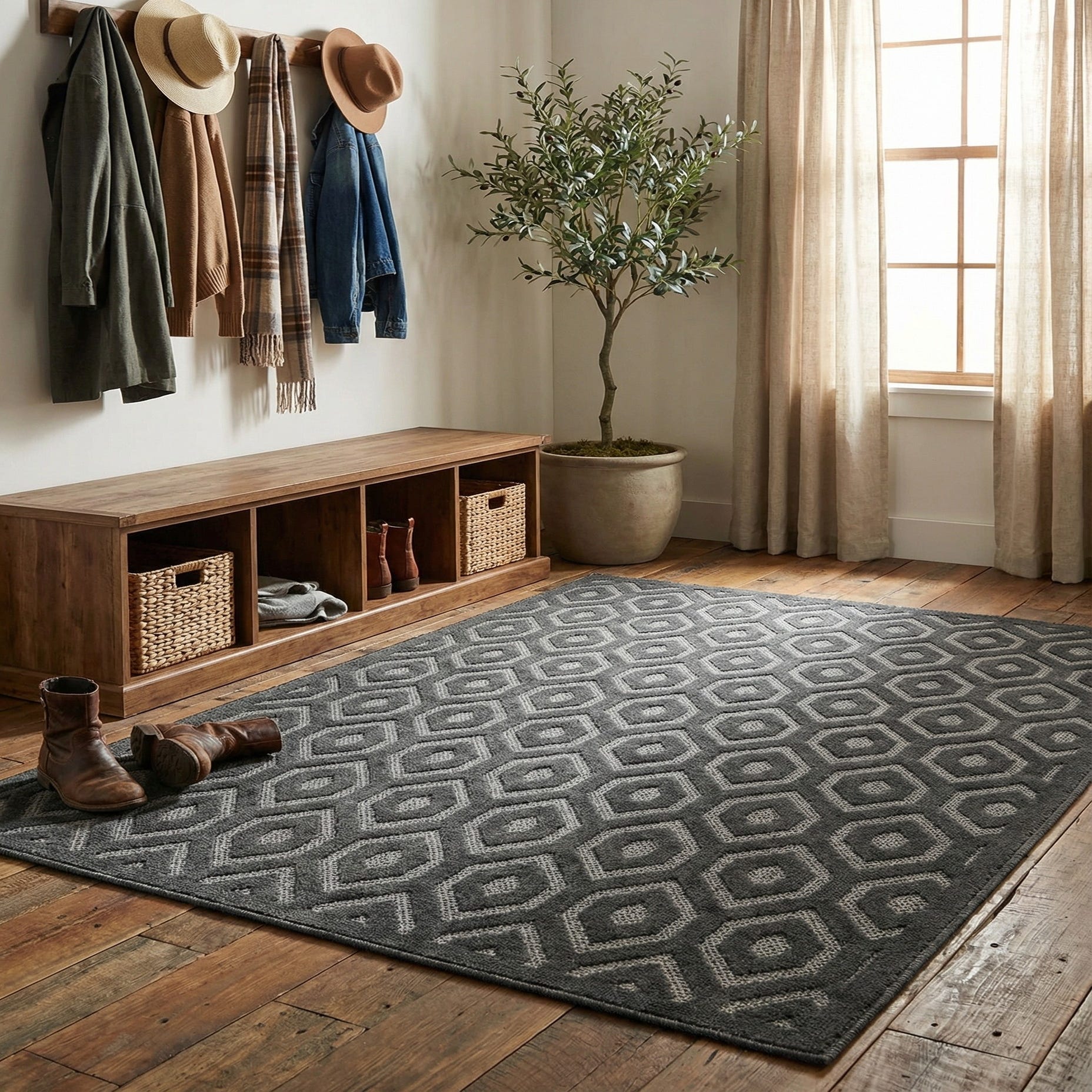 Balancing functionality with style, this rug is stain-resistant, pet-friendly, and designed to minimize shedding, making it an excellent choice for high-traffic outdoor spaces or casual indoor settings. Its contrasting color scheme and engaging geometric motif allow it to complement a wide variety of decor themes, from modern outdoor lounges to more traditional indoor spaces where resilience is as appreciated as aesthetic appeal. This versatile piece effortlessly anchors a patio seating area, completes the look of an informal dining space, or brings a touch of elegance to a sunroom.
