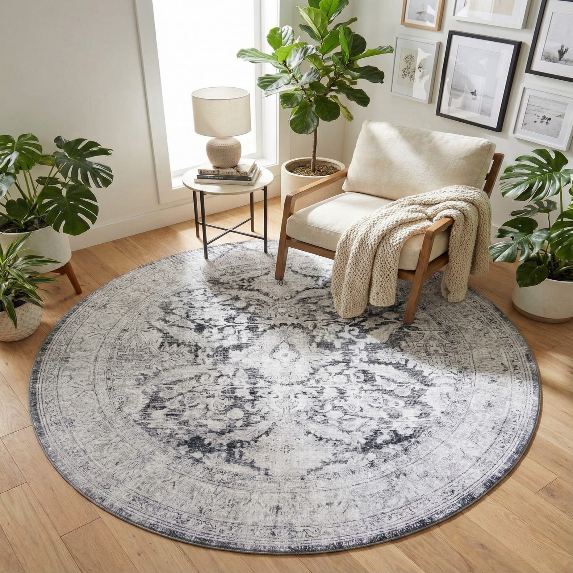 A softly worn medallion pattern gives this round rug a vintage-inspired character, with ivory motifs layered over a charcoal ground for clear contrast and depth. The ornate central design and narrow border read traditional but the distressed finish keeps the look relaxed and modern, making it a versatile anchor for a variety of interiors.