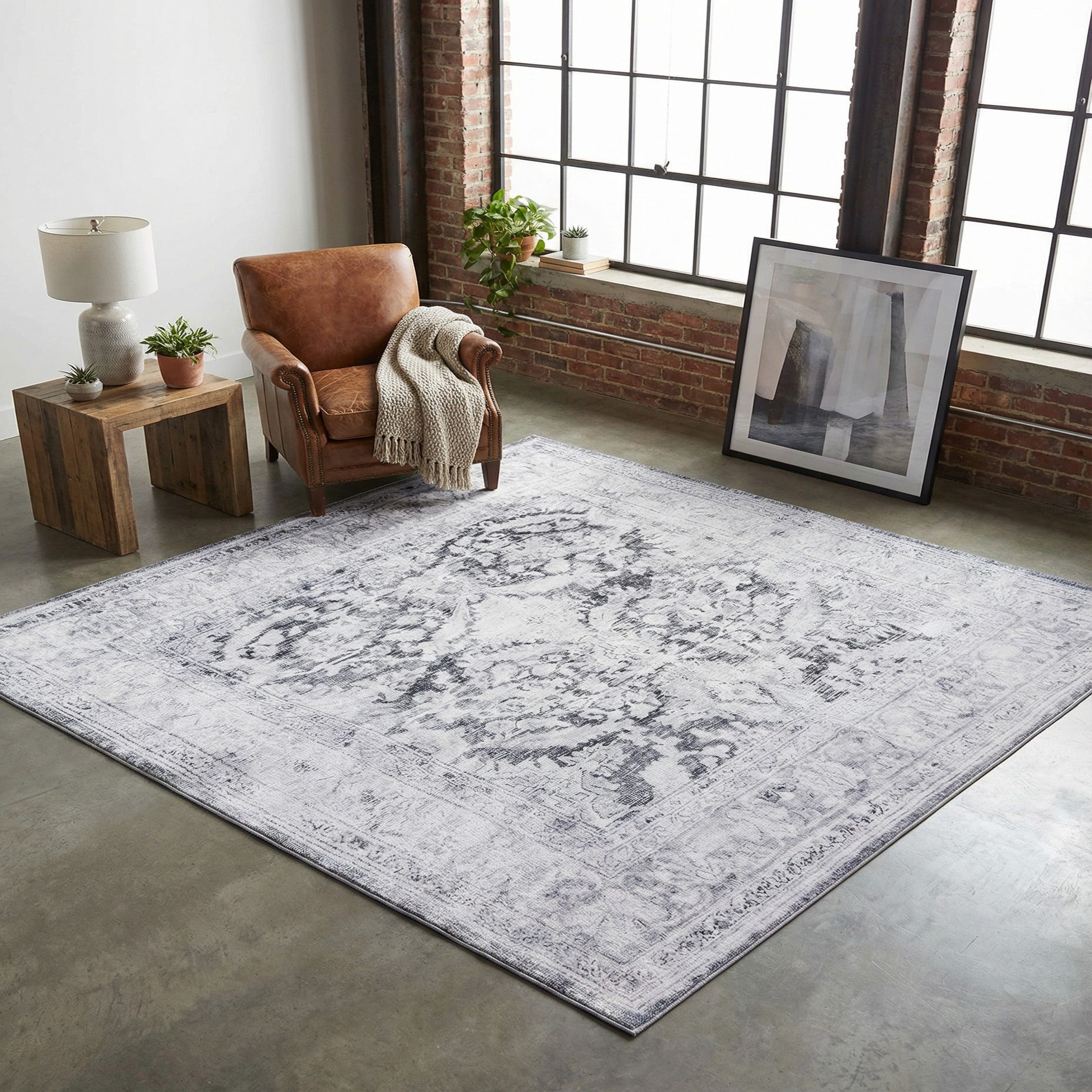 A classic medallion pattern sits against a charcoal field, rendered in a softly distressed ivory motif that gives the design an aged, low-contrast look. Floral and scrolling elements flow into a defined border, creating a traditional, vintage-inspired aesthetic with modern restraint. Machine-made from 100% polyester, the rug has a low pile with a smooth, slightly lustrous surface that feels soft underfoot while maintaining a structured, flat appearance.