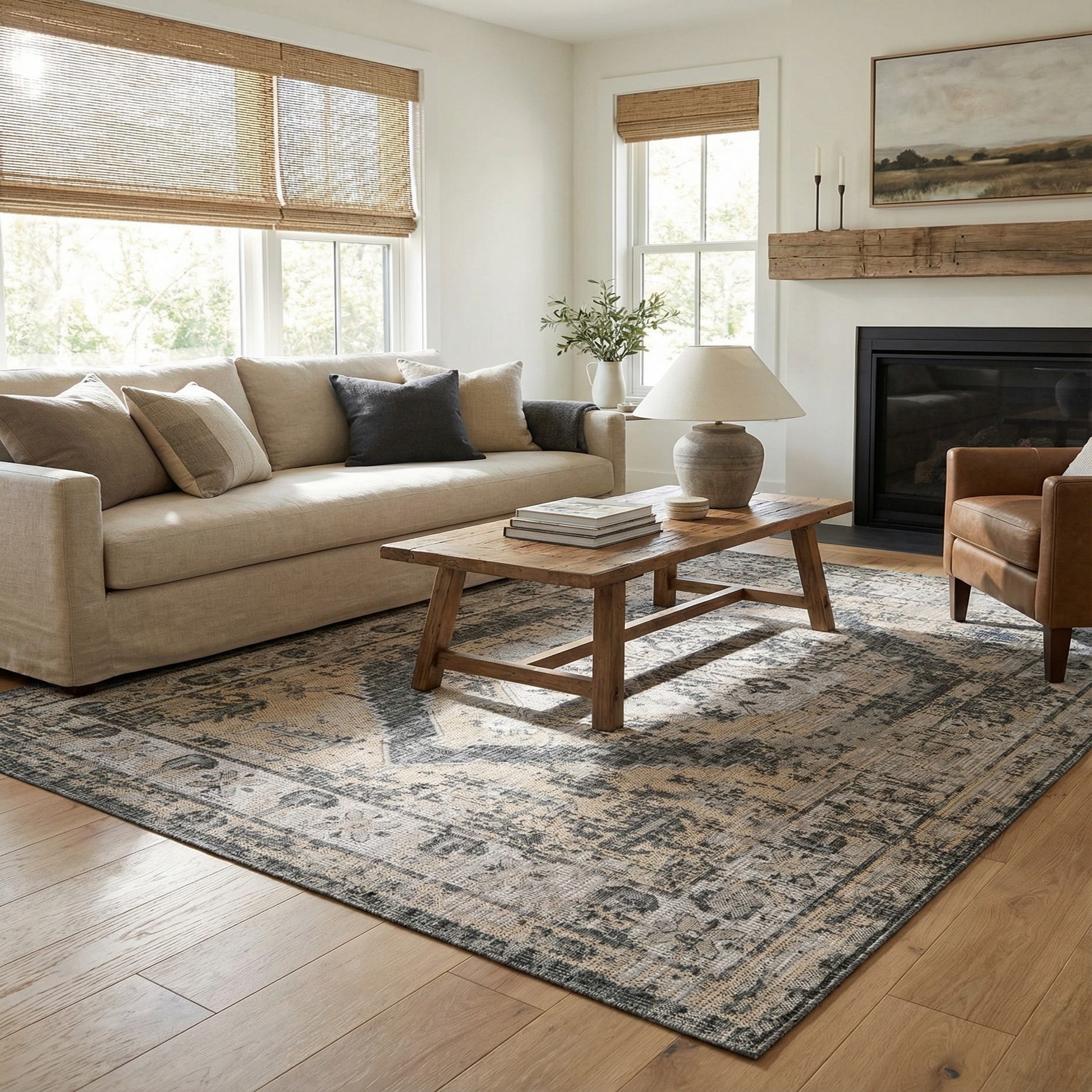 Machine-made for consistent pattern and finish, this rug works well where a neutral, grounded anchor is needed. Use it to define a covered patio conversation area, underneath a dining set on a screened porch, or in a living room with warm woods and linen upholstery. It pairs naturally with rattan or black metal furniture, layered natural fibers like jute, and a palette of soft neutrals and charcoal accents for a cohesive, relaxed look.
