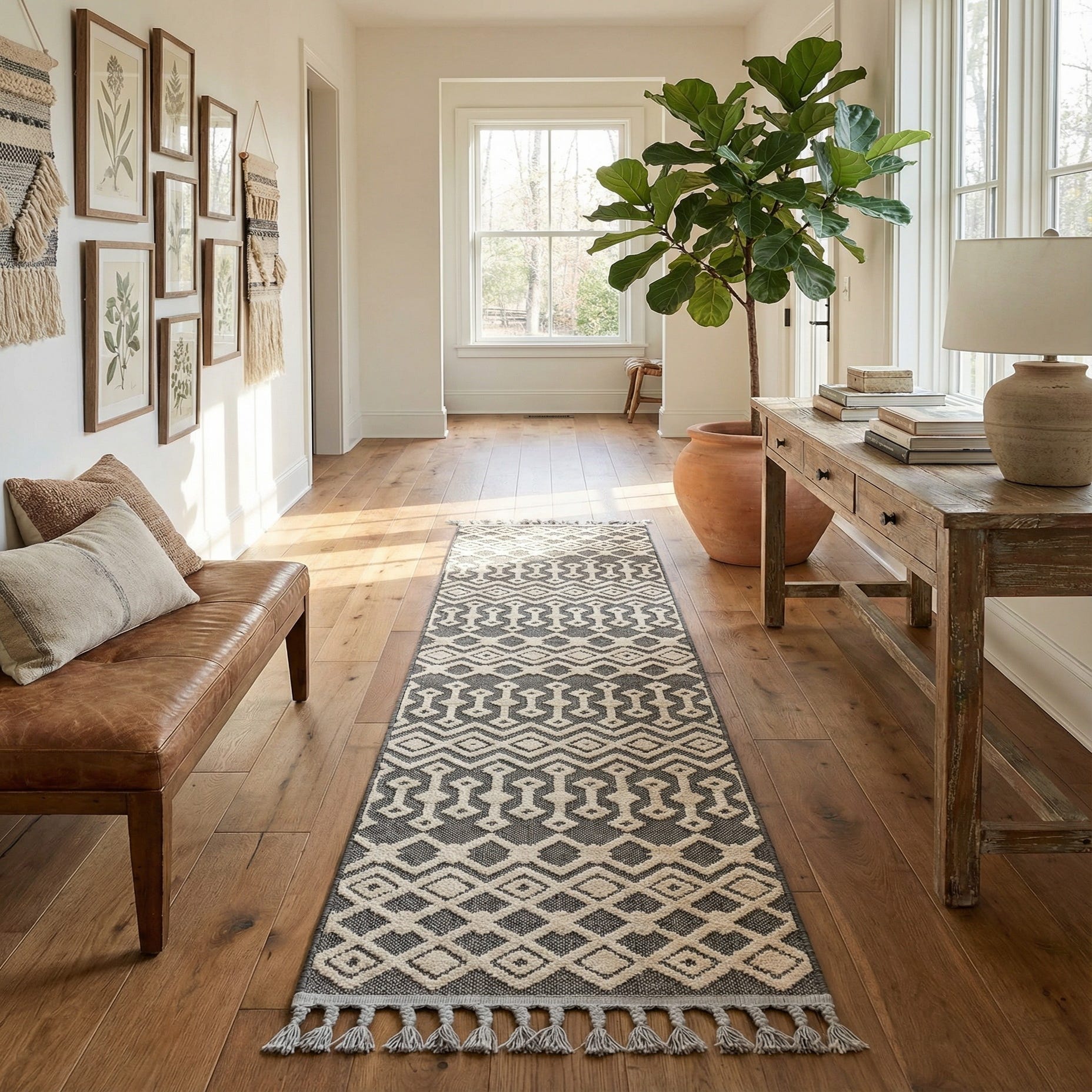 This runner works well in entryways, hallways, or alongside kitchen cabinets to define a narrow pathway. Pair it with light or medium wood floors, matte black or brass accents, and neutral upholstery for a balanced look. Its graphic, neutral palette complements modern farmhouse, Scandinavian, transitional, and layered bohemian interiors where pattern and texture are needed without overwhelming the space.