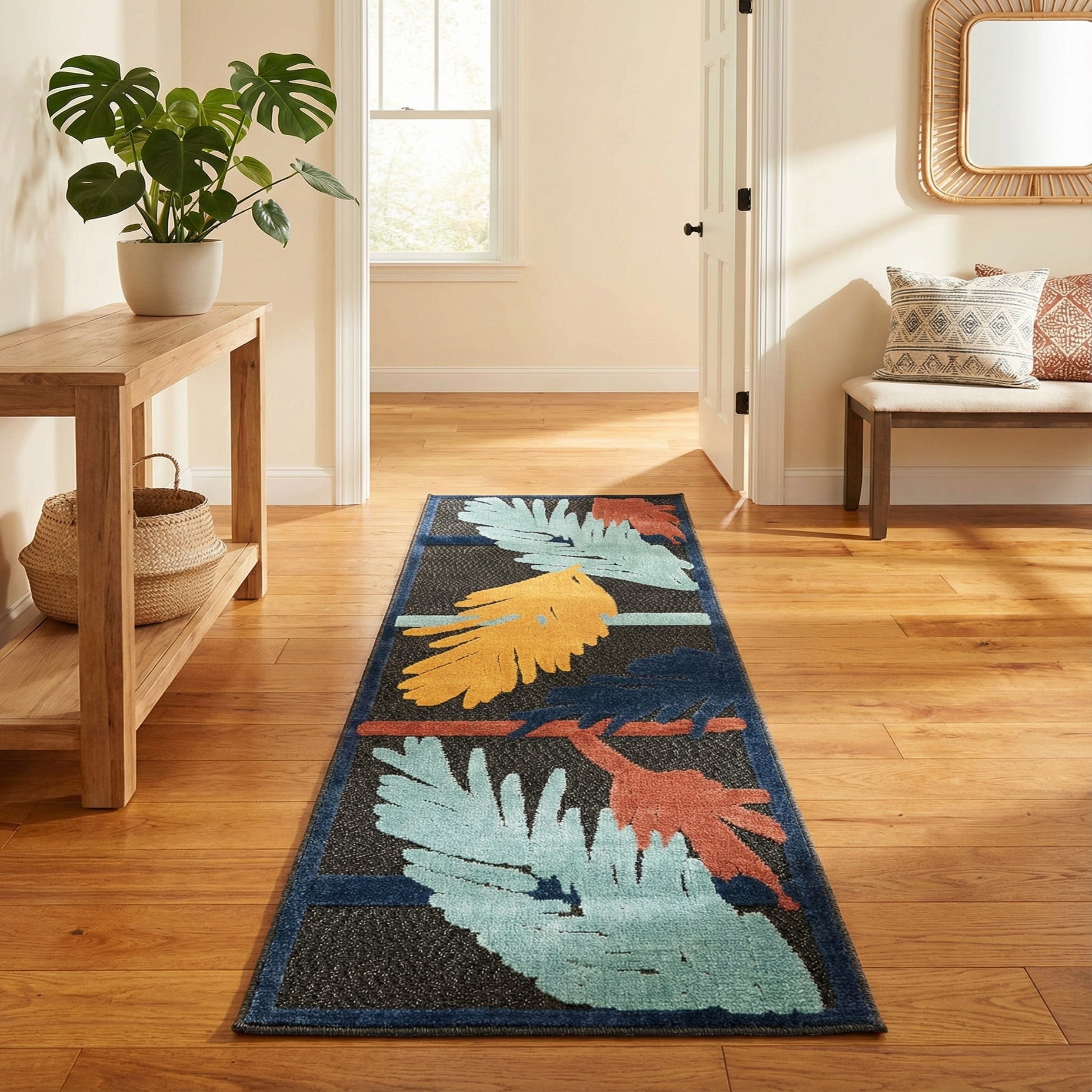 A black runner rug with large abstract botanical leaves in teal, orange, and navy, suitable for a hallway or patio.
