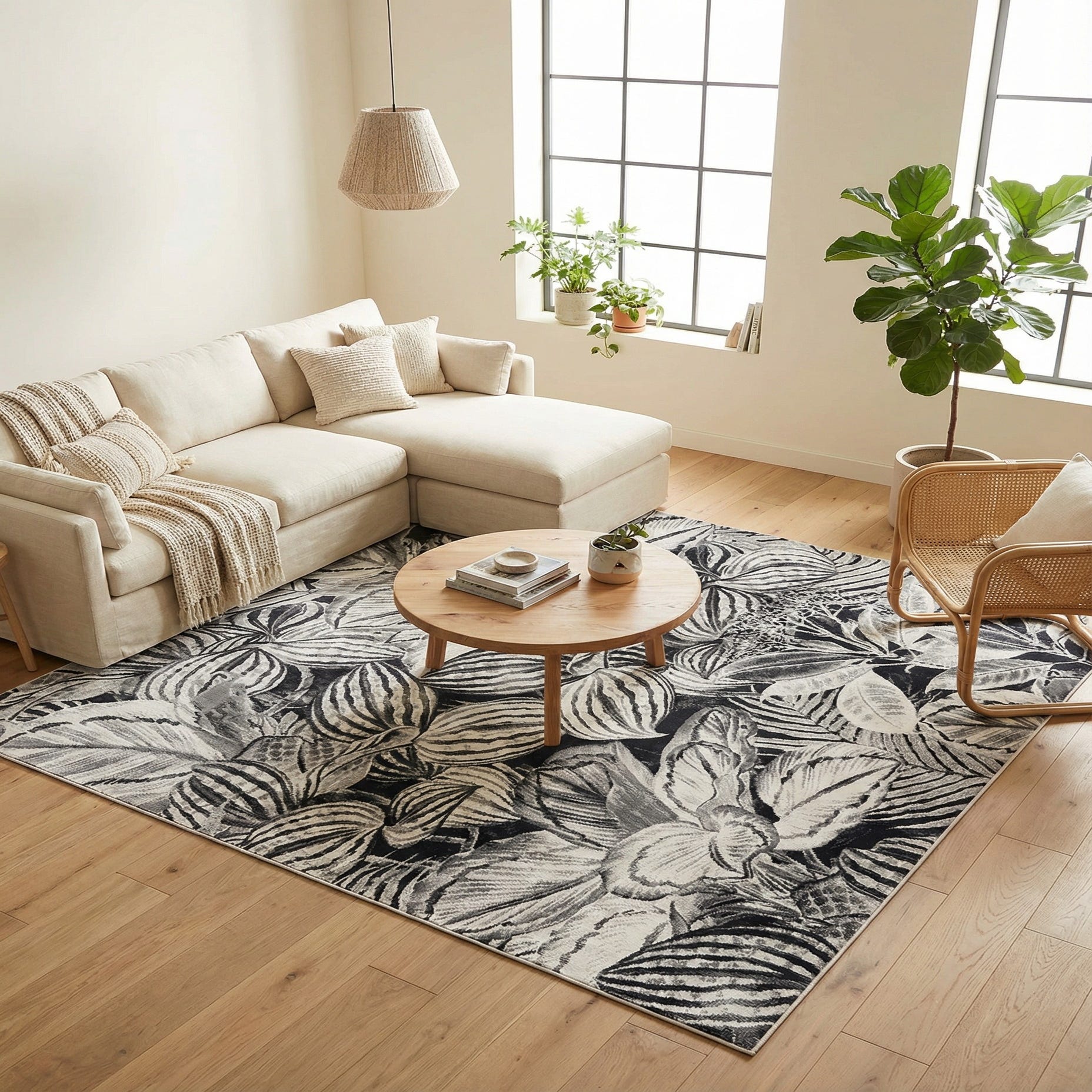 This monochrome botanical works well in contemporary and transitional interiors. Pair it with warm wood furniture and matte black metal accents for a modern organic feel, use it to anchor a neutral seating area, or place it under a dining table to introduce pattern without additional color. Its durable construction makes it suitable for higher-traffic rooms such as living rooms, entryways, or home offices where you want a statement pattern that holds up.