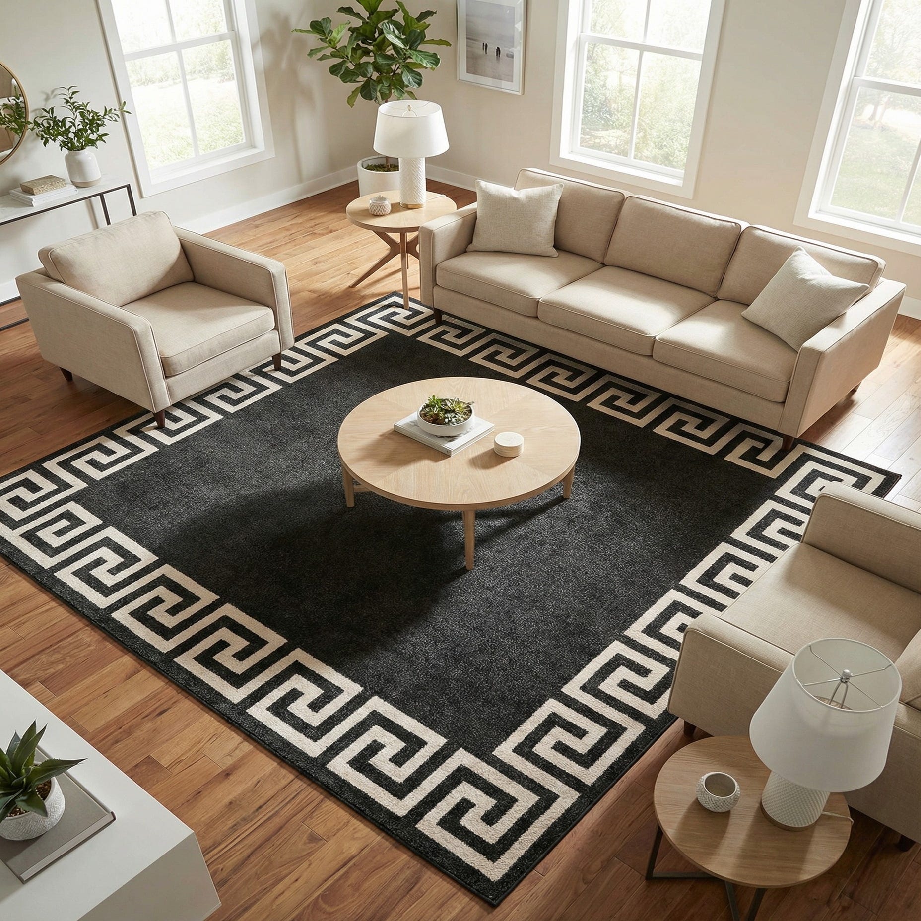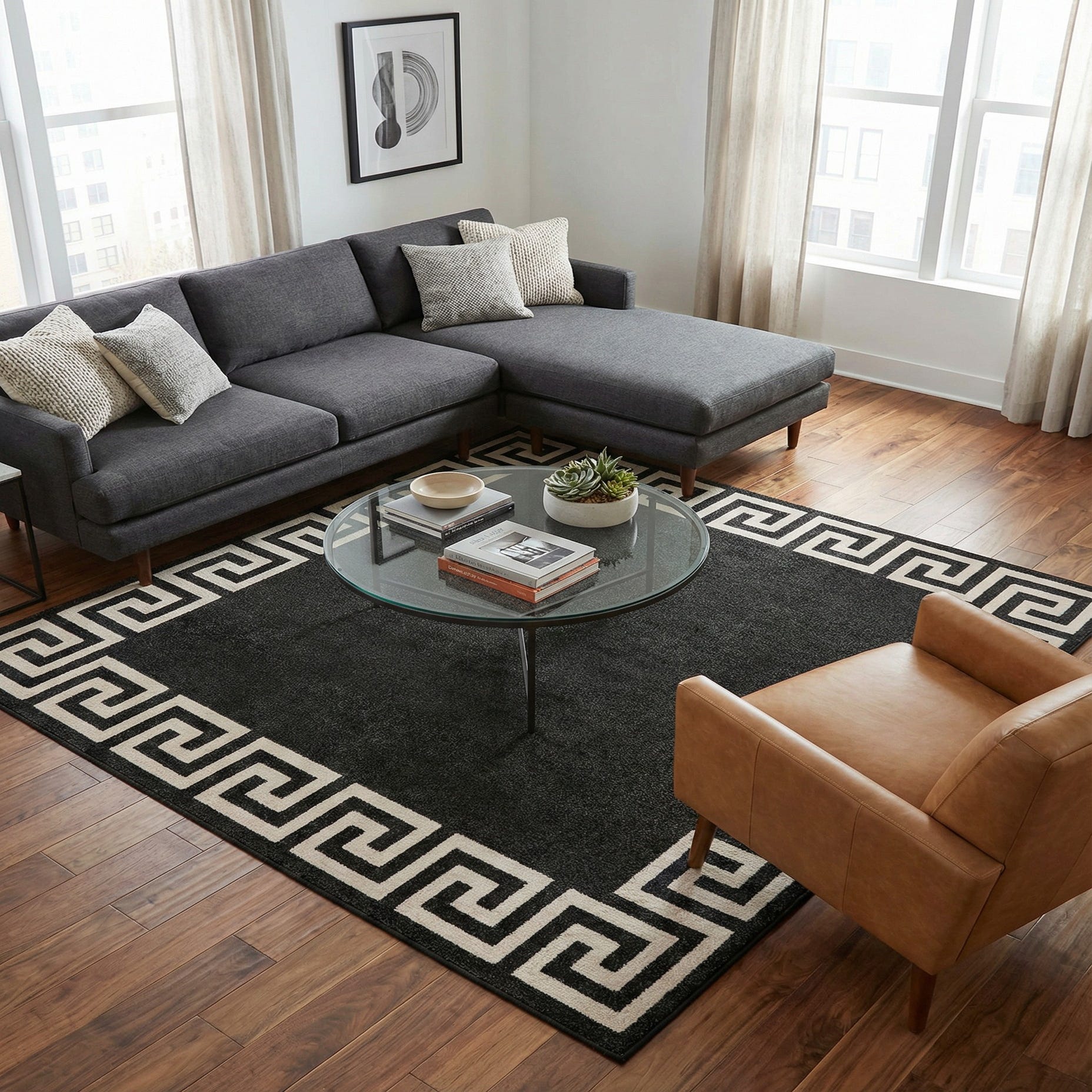 A deep charcoal field provides a calm, modern foundation while a bold Greek-key border in beige, outlined with black, gives the rug a crisp, architectural edge. The geometric motif wraps the perimeter with clean, repetitive lines that bring order and visual interest to the surface. Machine made from 100% polypropylene, the low, dense pile feels smooth underfoot and carries a subtle sheen that catches light without overpowering a room.