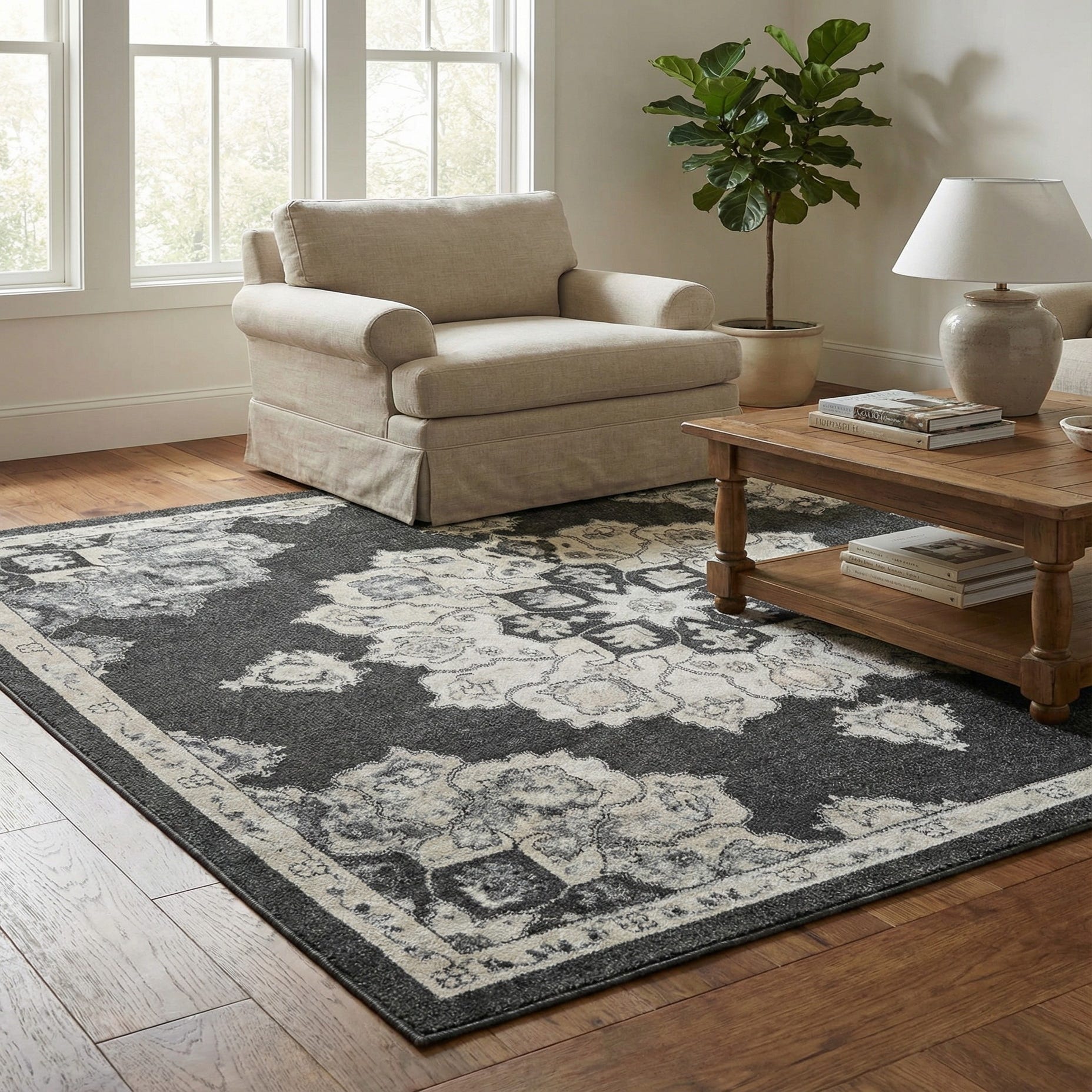 A bold charcoal field sets the stage for a classic medallion design in ivory and shades of gray. The pattern blends traditional floral motifs with a washed, slightly distressed finish that softens the contrast and gives the rug a layered, lived-in look. Machine-made from 100% polypropylene, the rug has a low pile with a smooth, even surface that feels firm underfoot while offering a touch of softness and a subtle sheen that highlights the ivory and gray details against the dark background.