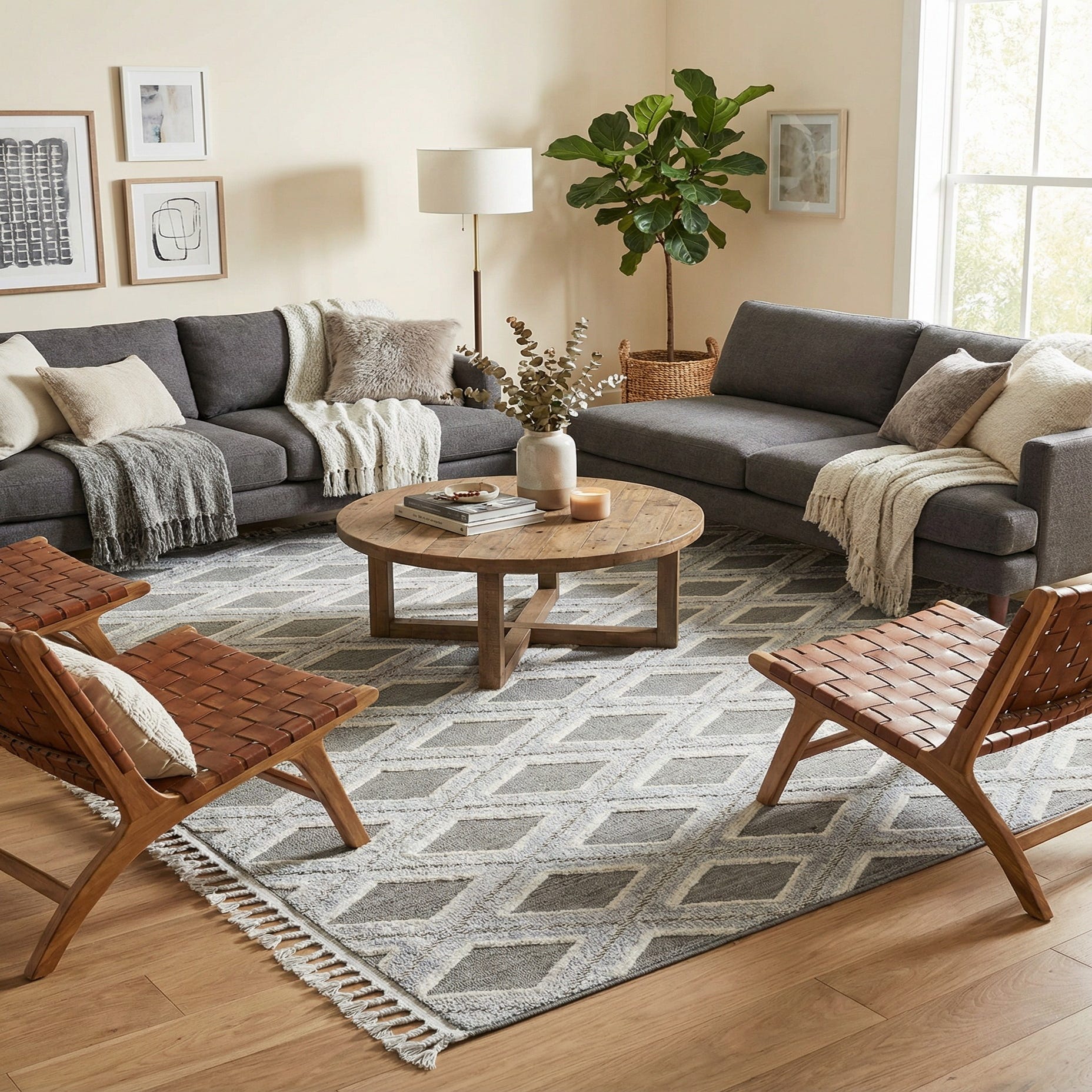 A repeating diamond-lattice pattern plays across a deep charcoal ground, with interlocking lozenges in tones of gray and black that create quiet movement without competing with existing furnishings. The geometric motif is rendered in a slightly raised pile that contrasts with the flatter background, giving the surface a tactile, dimensional quality you can feel when you run your hand across it. Short knotted fringe at the narrow ends adds a subtle finishing detail.