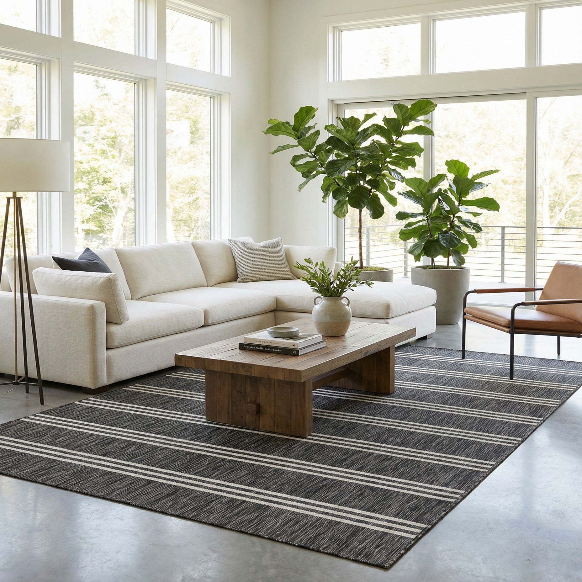 Machine made from 100% polypropylene, this low-profile, flatwoven piece has a firm, slightly textured hand that lays flat beneath furniture and holds up in high-traffic or outdoor settings. It works well beneath a patio seating group or dining set on a covered porch, in a sunroom or mudroom where durability matters, and in contemporary indoor living spaces where a simple, graphic anchor is desired. Pair it with light woods and woven textures for a relaxed vibe, or with black metal and concrete finishes for a more refined, modern feel.