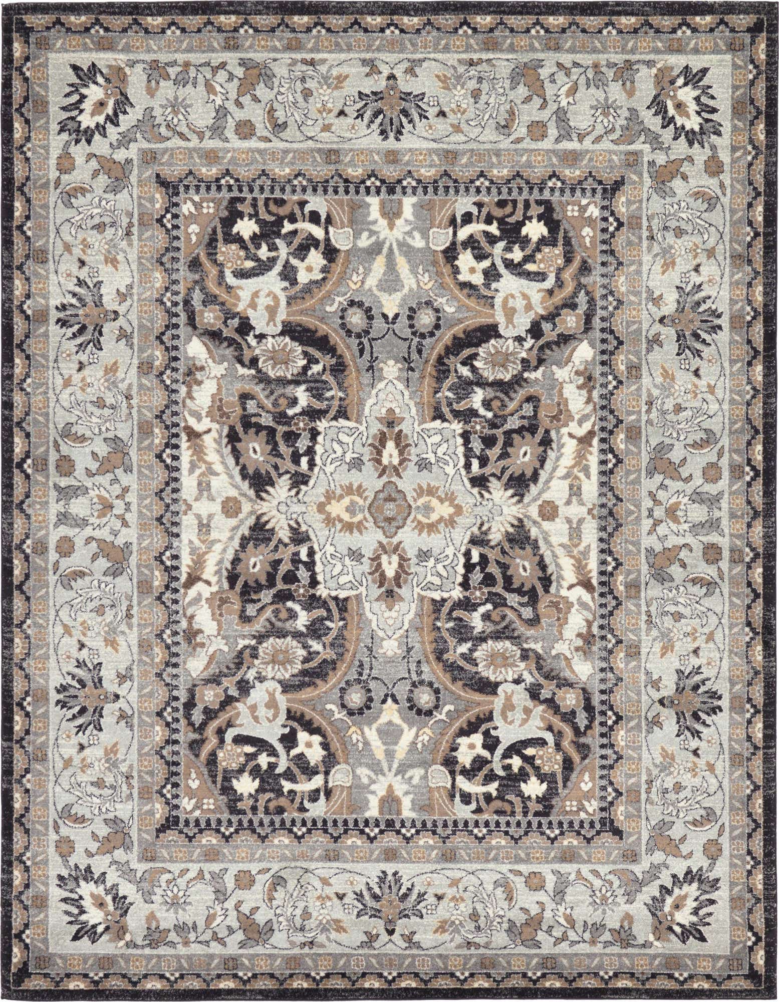 Primary color is Charcoal. Colors in this rug include: Charcoal, Black, Light Brown, Tan, Silver.