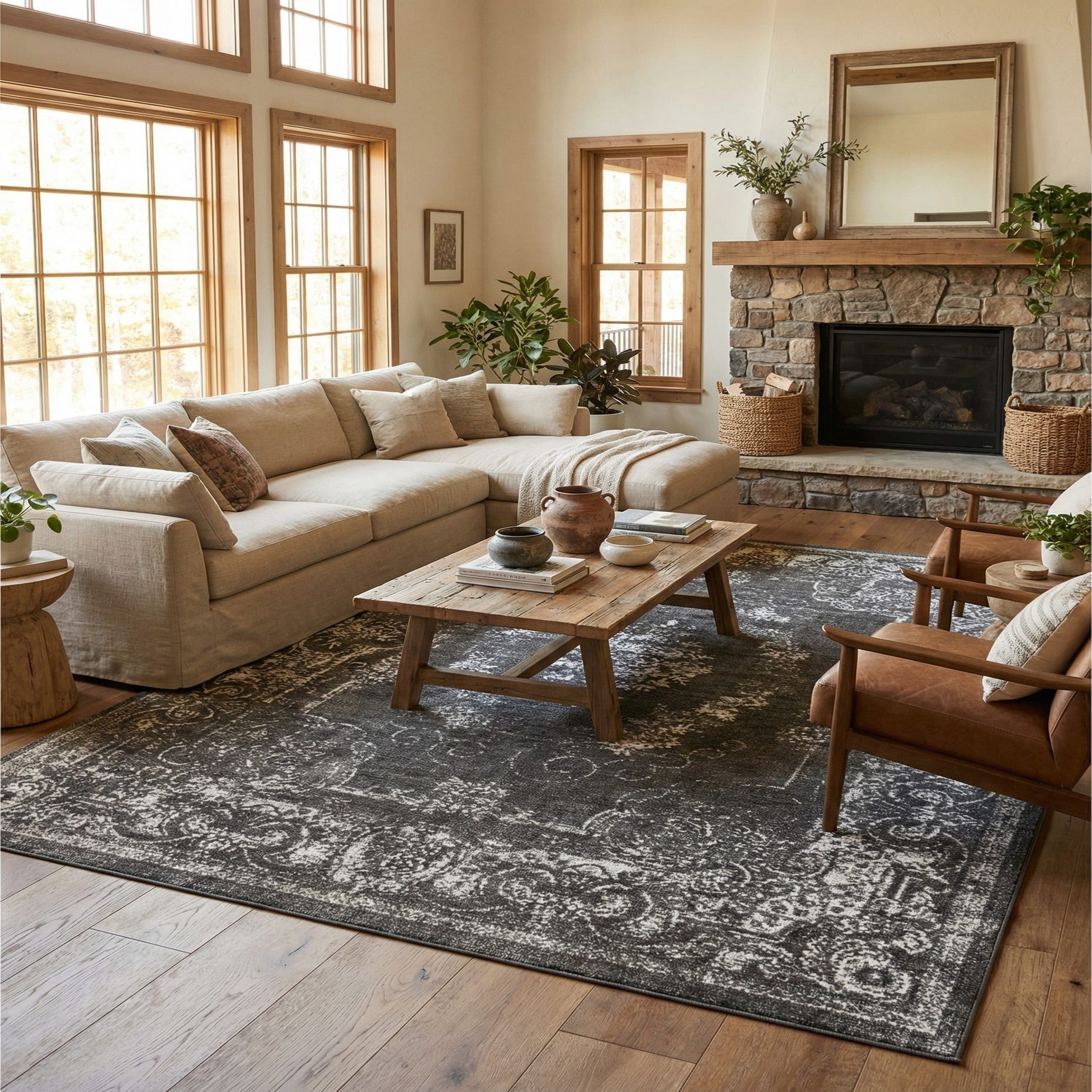 This rug works well as an anchor beneath a seating group in a living room or layered under a dining table, and it’s equally at home in a bedroom or home office where a classic touch is wanted. Pair it with warm wood furniture and leather accents for a modern-industrial look, or combine it with neutral upholstery and metallic finishes for a transitional scheme. The charcoal background provides a strong visual base that complements both light and dark furnishings.