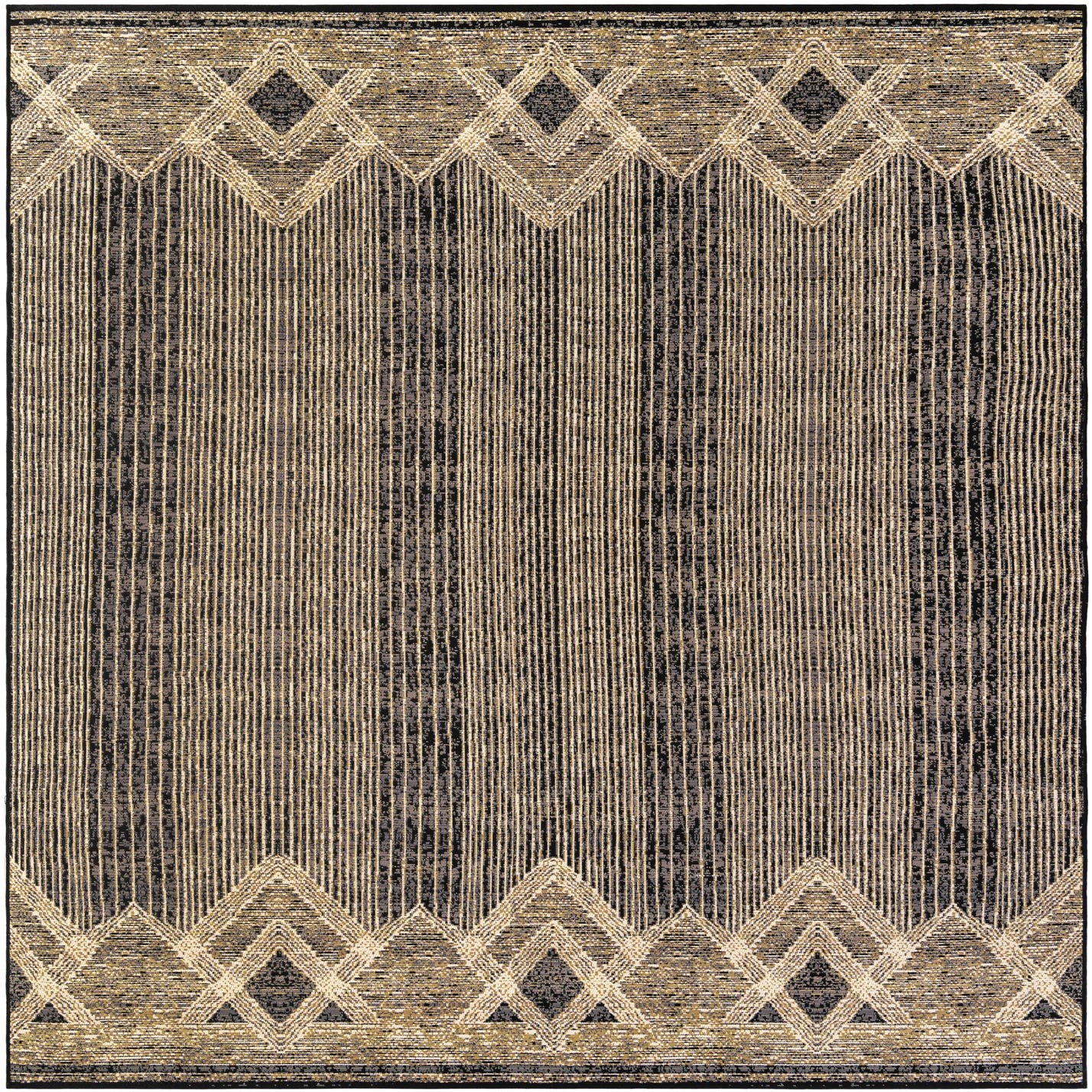 An 8x11 rectangular modern indoor/outdoor rug featuring a black and gray background with vertical gold stripes and geometric diamond borders.