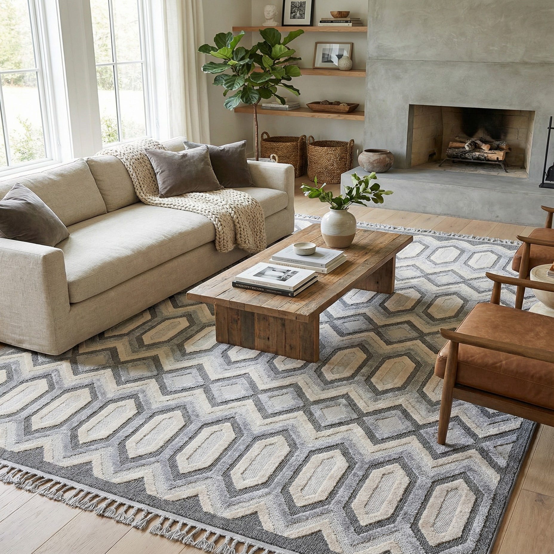 This rug works well in contemporary and transitional rooms where a structured pattern can bring order to the space — try it beneath a sectional in a living room, under a dining table to ground a neutral scheme, or in a home office to add a graphic element without overpowering furnishings. It pairs nicely with light wood tones, charcoal or beige upholstery, and mixed-metal accents for a modern, layered look.
