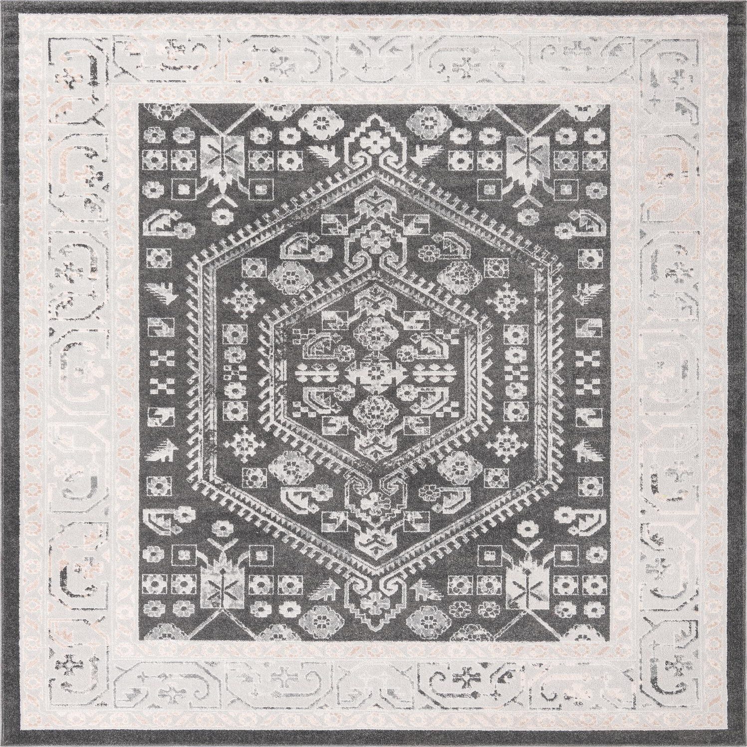 A classic medallion layout gives this rug a refined, traditional character while a simplified, ornamental border keeps the overall look modern. The charcoal field provides a deep, steady background for black accents and ivory motifs—geometric florals, small squares and scrolling details combine to create a balanced, symmetrical pattern. Machine-made in 100% polypropylene, the low-profile pile has a smooth, slightly plush hand that feels comfortable underfoot and maintains a clean, finished appearance beneath furniture.
