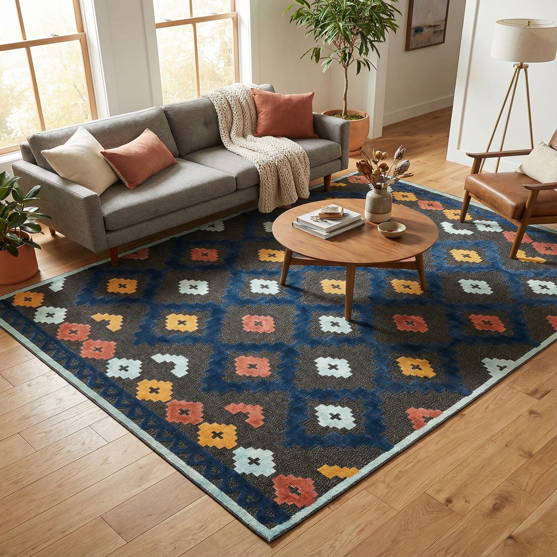 Primary color is Charcoal. Colors in this rug include: Charcoal, Light Blue, Navy Blue, Yellow, Pink.