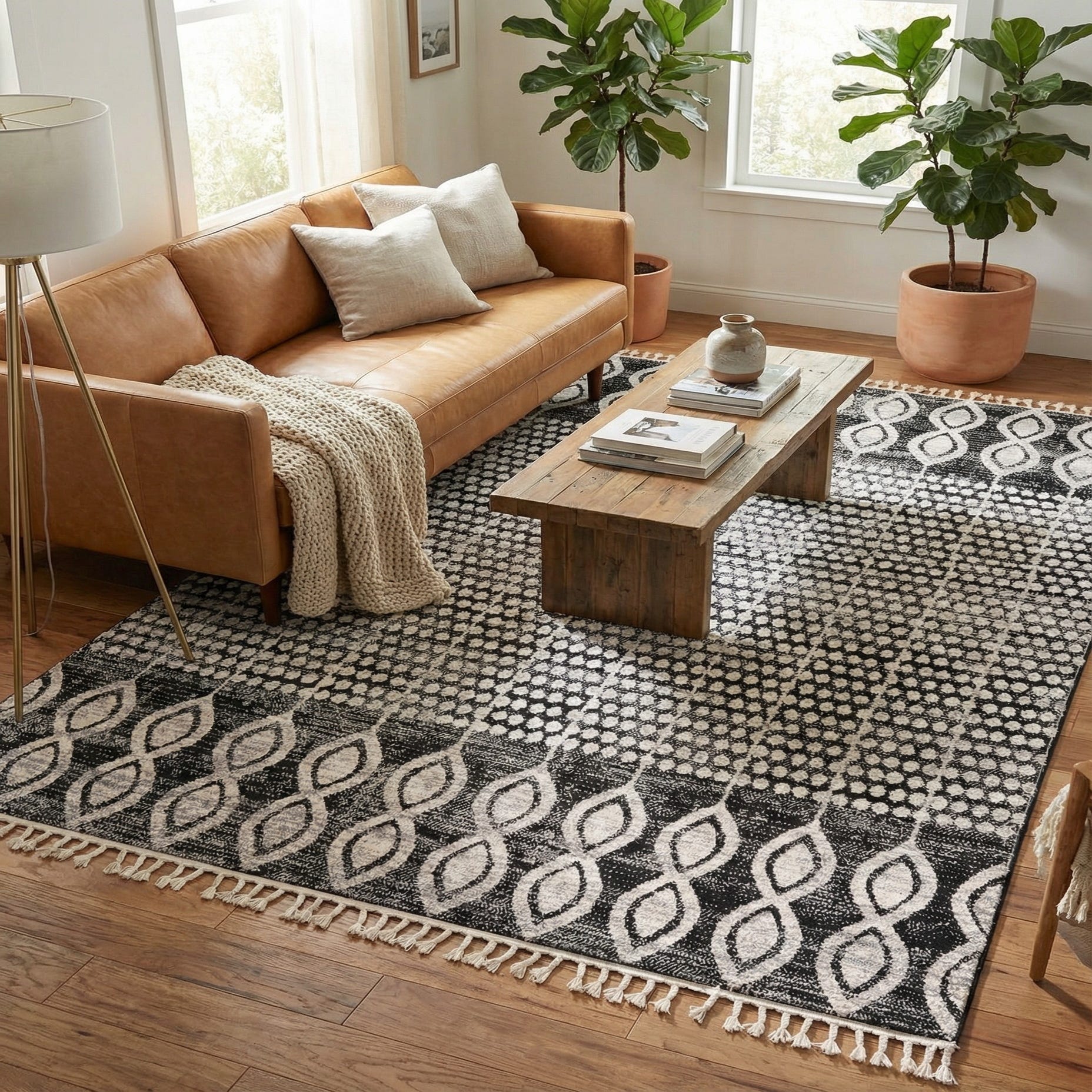 This versatile palette and pattern work well in contemporary, transitional, or industrial interiors. Place it under a sofa and coffee table to ground a living area, layer it beneath a dining table for contrast against warm wood tones, or use it in a monochrome bedroom to introduce pattern without overwhelming the space. It pairs nicely with leather furnishings, brushed metal accents, and neutral linens for a cohesive, modern look.