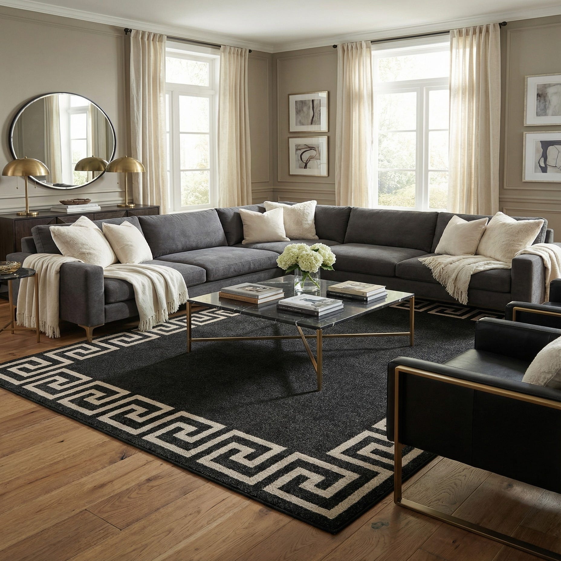 A 9x12 rectangular black area rug with a bold, light beige Greek key border pattern, suitable for a living room.