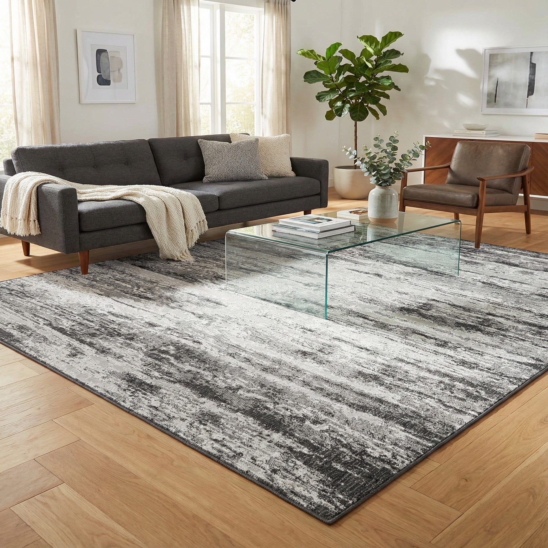 This rug works well on a covered patio or balcony, under an outdoor dining set, or as a grounding element in a contemporary living room or office. Pair it with clean-lined furniture in light woods, matte metals, or monochrome upholstery to play off the charcoal and ivory contrast, or layer it beneath a glass-top table to let the pattern show through.