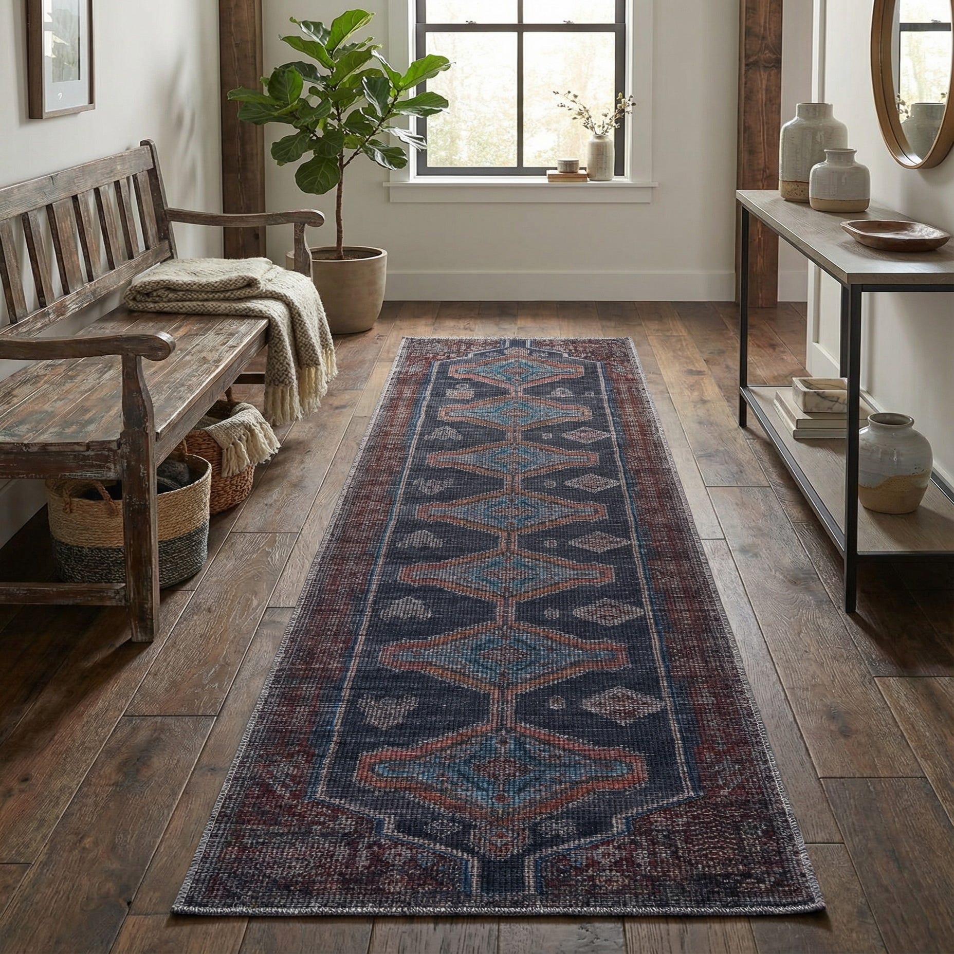 Machine-made from polyester chenille, the surface feels soft and slightly velvety underfoot, with a low-profile texture that lays comfortably in high-traffic walkways. Use it to anchor a long hallway or entry, run alongside a bed to add warmth to a bedroom, or place it in a narrow kitchen aisle for color and pattern without bulk. It pairs well with warm woods and brass or matte black accents, and fits transitional, traditional, or modern-farmhouse interiors where a subtle, aged look and layered blues and grays are desired.