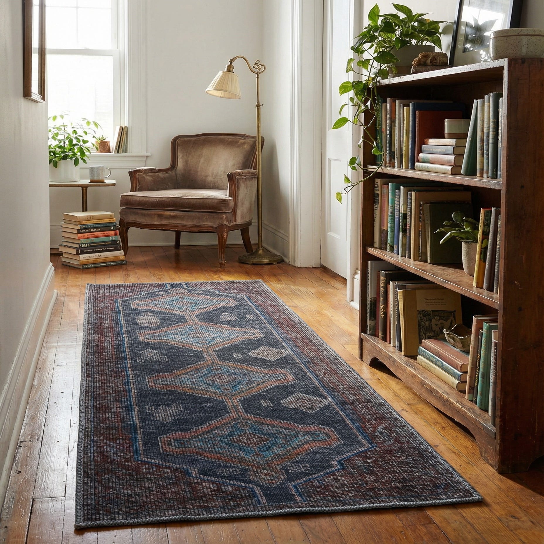 An antique-inspired medallion runner with a narrow patterned border, this rug places three connected geometric medallions along a charcoal-gray field. Rich accents of blue and navy bring depth to the central motifs, while red, brown and ivory highlights trace the smaller floral and diamond details for a layered, timeworn effect. The overall pattern leans traditional with a subtly distressed appearance that reads as collected rather than new.