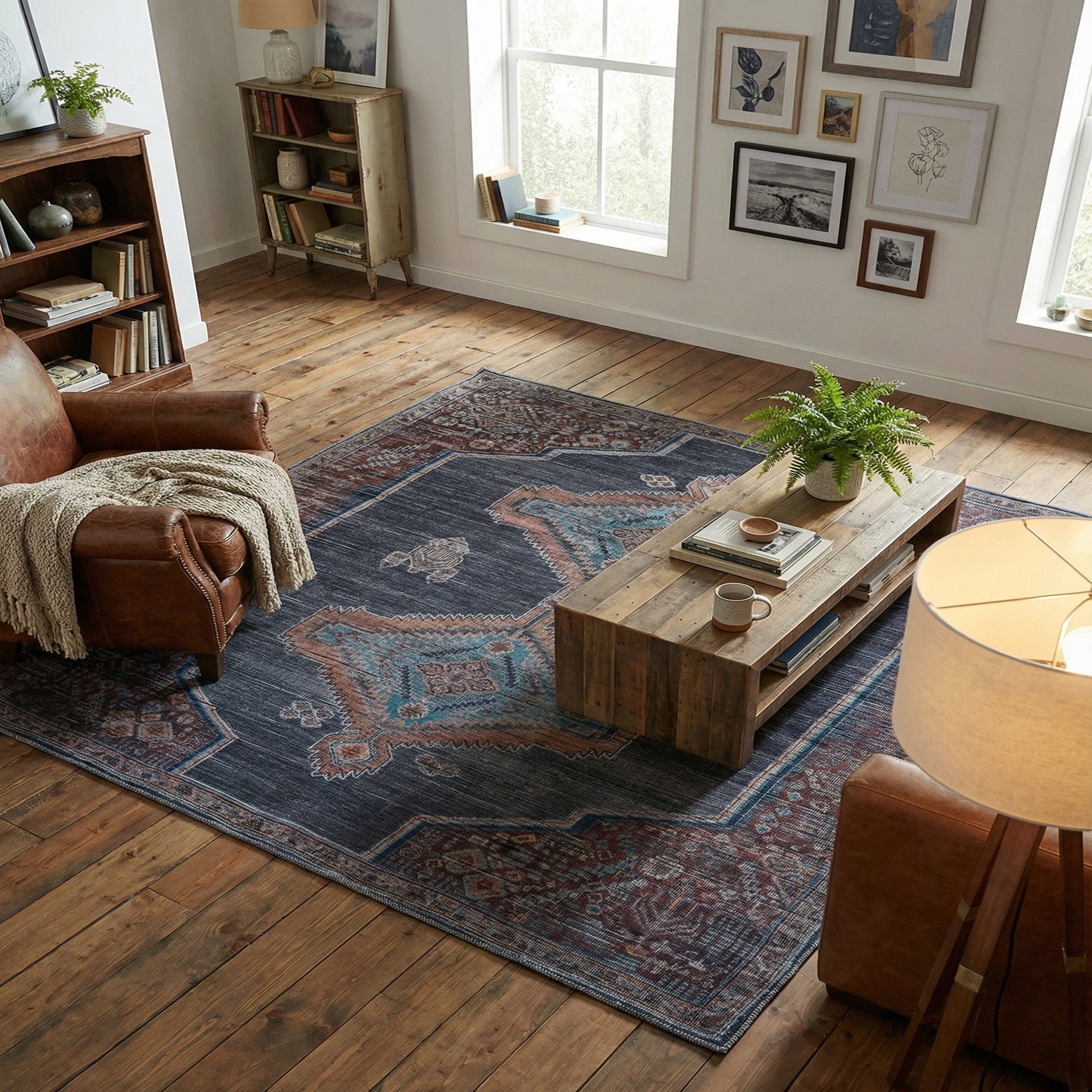 Machine-made of polyester chenille, the surface has a soft, velvety hand and a muted sheen that catches light without glare. Blues — from light to navy — sit alongside warm browns, touches of ivory and gray, and hints of red that add depth and warmth to the palette. Works well as an anchor for a living room seating area or beneath a dining table to ground a darker wood finish; it also layers nicely in an office or bedroom to add pattern without overwhelming the room. The mix of traditional patterning and contemporary color depth suits transitional, industrial, or eclectic interiors that balance texture and timeless motifs.